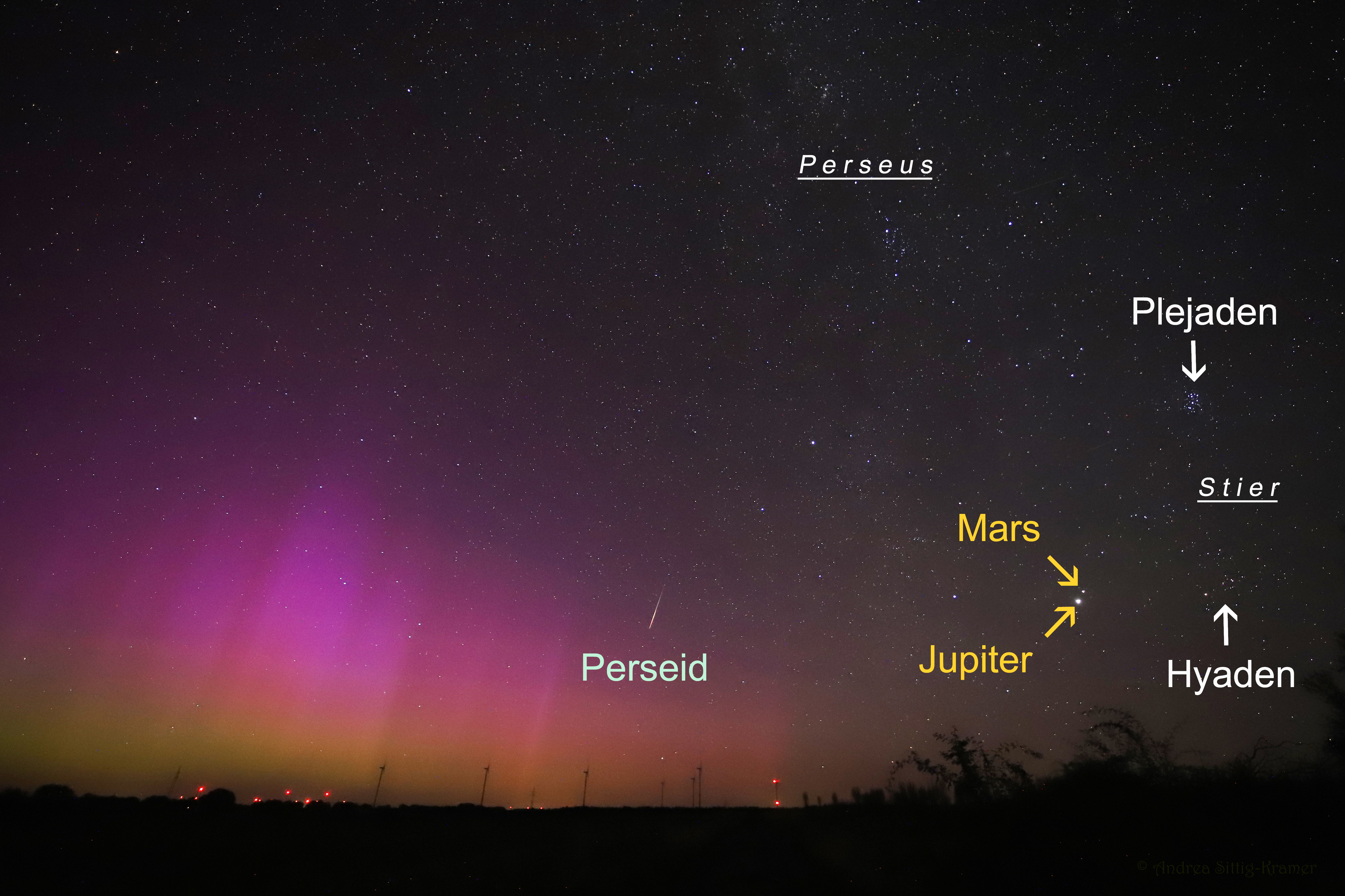 Leserbilder Astronomie: Jupiter-Mars Konjunktion mit Polarlichtern und Perseid über Uelzen am 13. August 2024 (beschriftet)