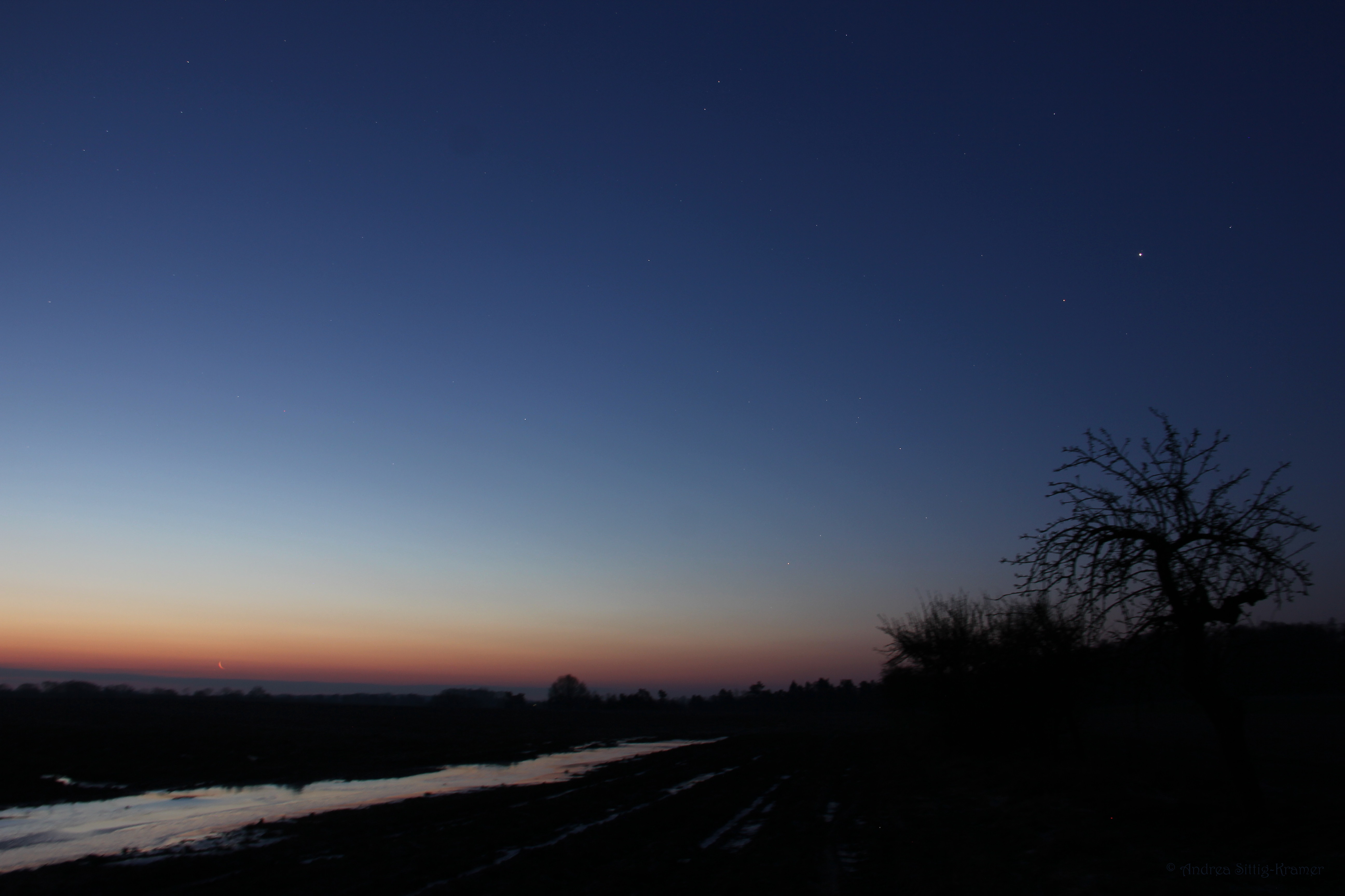 Am Morgen des 15. Januar 2018 konnte ich bei endlich wolkenfreiem Himmel die enge Stellung von Jupiter und Mars im Sternbild Waage beobachten. Um 7:17 Uhr gesellte sich der zu drei Prozent beleuchtete Erdtrabant zu dem wunderschön anzusehendem Himmelsschauspiel. Dies war die letzte Sichtbarkeit der superschmalen Mondsichel vor Neumond. Das Szenario wurde bei klirrender Kälte von einer farbenprächtigen Morgendämmerung begleitet.