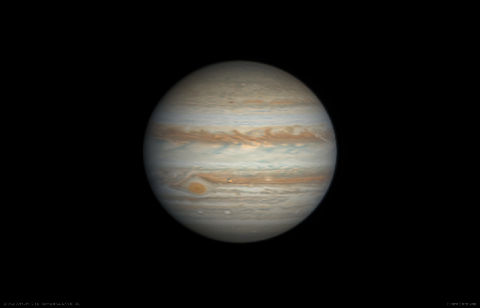Das Seeing war am 15. Februar 2024 auf La Palma nicht besonders gut und unter normalen Umständen hätte ich vielleicht die Videoaufnahmen abgebrochen. Ich wollte aber das neue Feature das im Derotations-Programm WinJUPOS seit 14. Februar aktiv ist unbedingt testen, siehe auch dazu meinen Beitrag mit Erklärung vom 15. Februar. Es wurden bei diesem Bild insgesamt 40 Bilder zur Bildberechnung verwendet, die in einer Zeit von 1 Stunde und 8 Minuten aufgenommen wurden! Diese lange Zeit hätte vor der neuen WinJUPOS Version sehr starke Randartefakte gezeigt. Jetzt aber sehen die Ränder perfekt aus und das selbst bei einer solch langen Zeit. Ich bin mir relativ sicher, dass es möglich ist bis über zwei Stunden Material zu derotieren, vielleicht auch noch mehr. Wichtig dabei ist das es keine sehr langen Pausen ohne Bilder gibt. Wenn zum Beispiel am Anfang einer zwei Stunden langen Aufnahme 20 Bilder verwendet werden, dann 80 Minuten gar kein Bild da ist, und zum Schluss wieder 20 Bilder kommen, ergeben sich ausgegraute Stellen in der Mitte, die keine oder wenig Strukturen zeigen. Deswegen ist es wichtig keine allzu großen Pausen zu haben. Fünf oder auch zehn Minuten sind allerdings kein Problem.