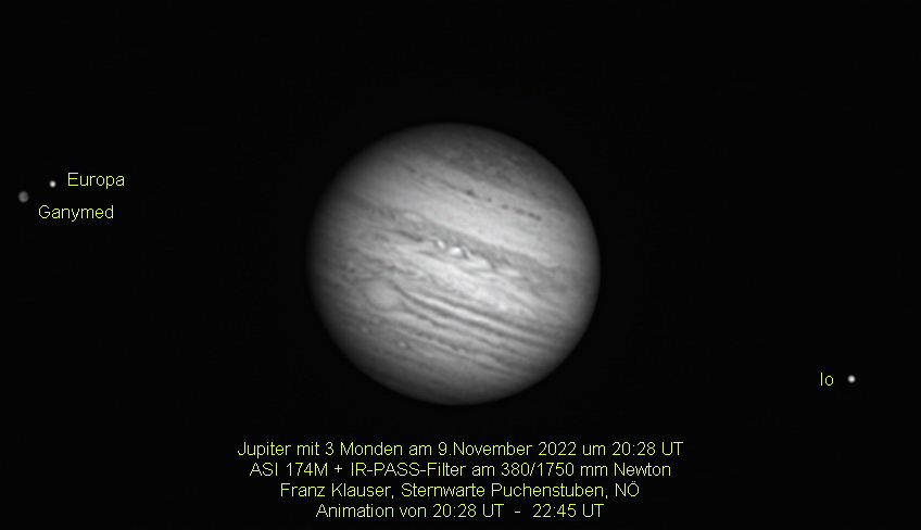 Im Datenarchiv habe ich Jupiterbilder gefunden, wo auch Monde mit im Bild waren. Aufnahmen nur in SW mit einer ASI 174 MM und Filterrad mit IR-Passfilter. Das Bild ist der Start einer Aufnahmeserie.