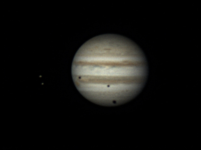 Am Morgen des 12. Okt. 2013 konnte man 3 Mondschatten gleichzeitig auf Jupiter beobachten. Norden ist im Bild oben. Der Schatten ganz im Süden stammt von Kallisto, darüber der Schatten von Europa und am linken Planetenrand der von Io. Links von Jupiter erkennt man die Monde Europa (unten) und Io (oben). Die Bedingungen waren wie leider meistens bei uns nicht optimal. Die Aufnahme entstand durch Schleierwolken hindurch und sofort danach war der Himmel wieder komplett zugezogen.