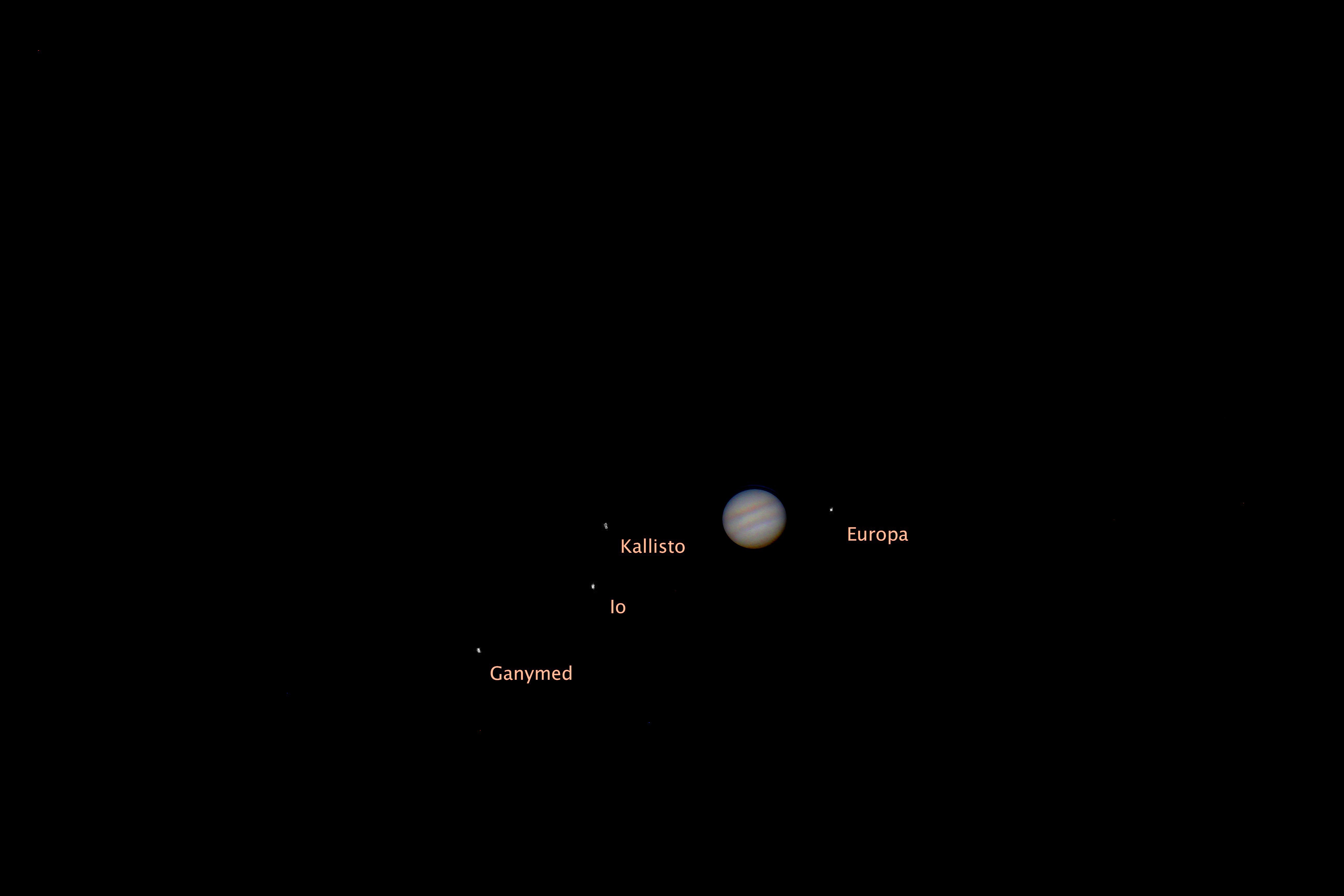 Diesmal stehen die vier Monde kompakt bei Jupiter. Auf Grund von aufziehendem Nebel sind die Monde sehr schwach abgebildet.
