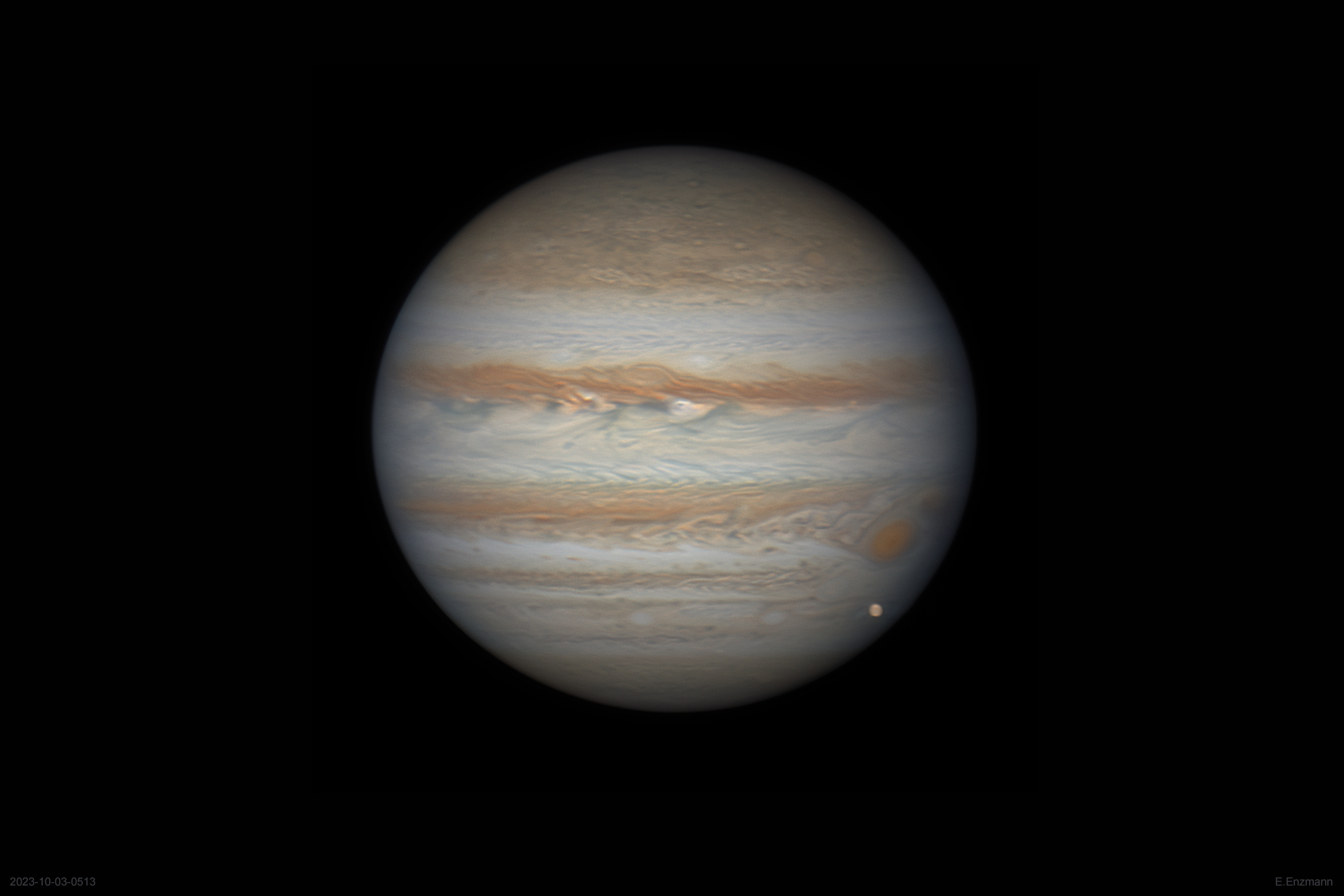 Jupiter mit dem Eismond Europa unterhalb vom Roten Fleck. Eine Aufnahme aus La Palma vom 3. Oktober 2023.