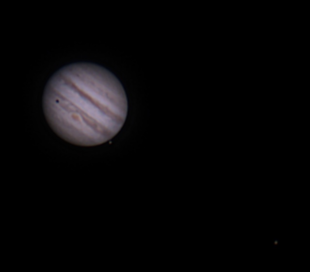 hier nun eines meiner Ergebnisse mit dem ETX 125, Alccd 5L - IIc und leider keinem so guten Seeing wie erhofft :-). Dieses Bild wurde mit Autostakkert (rund 2000 Bilder aus dem Video), Fitswork und PS erstellt. Europa als Schattenwerfer kurz nach dem Durchgangsende und der Schatten selber gaben ein schönes Schauspiel!