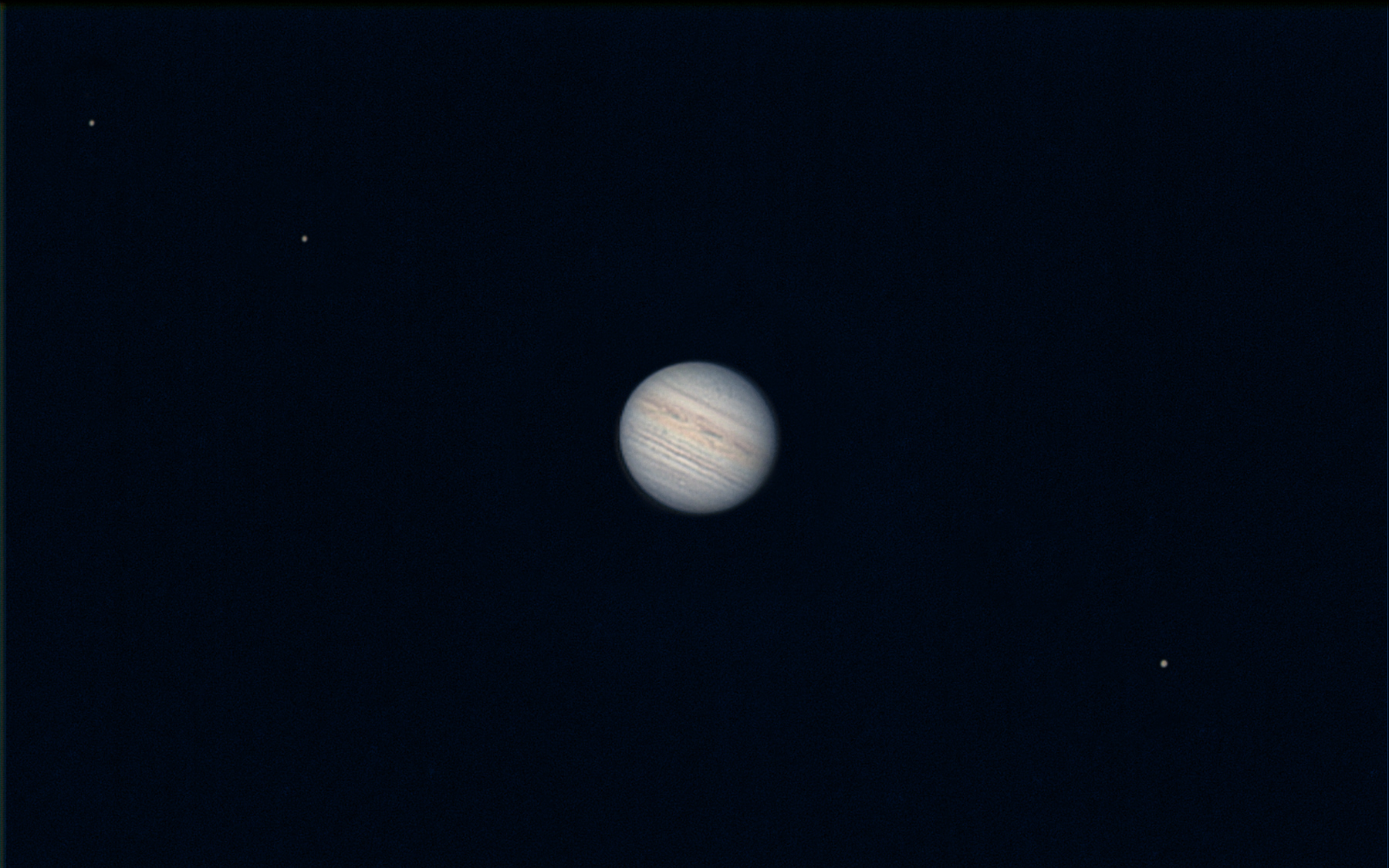 Jupiter ist am Morgenhimmel schon wieder weit genug von der Sonne entfernt, dass man ihn gut beobachten kann. Am 1. Juni 2021 konnte der Gasplanet mit drei seiner Monde abgelichtet werden: Europa und Io im Osten und Ganymed (mit anfänglichen Details) im Westen. Der Große Rote Fleck taucht gerade im Osten der Planetenscheibe auf.