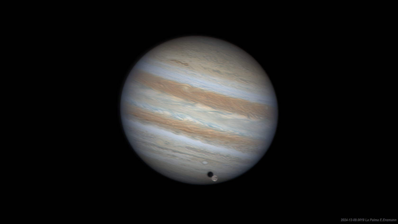 Jupiter am 9. Dezember 2024 aus La Palma mit Mond Ganymed und seinem Schatten auf Jupiter. Die Aufnahme wurde off axis gemacht. 13 x 120 sek.