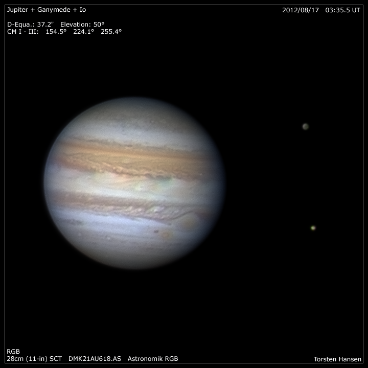 An diesem Morgen herrschte an meinem Standort sehr ruhige Luft. Auf Jupiter sind viele Details sichtbar, z.B. die Wirbelschleppe hinter dem GRF, das Oval BA mit ovalem Ring und feine Strukturen im NEB.