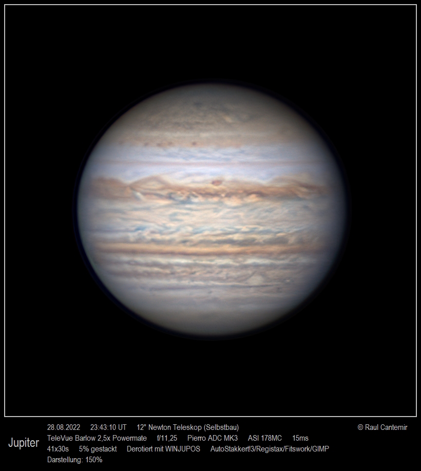 Am 29. August 2022 war das Seeing überwiegend konstant. Dementsprechend waren auch mehrere Aufnahmen möglich, die in einzelne Abschnitt unterteilt und mit WINJUPOS derotiert wurden. Im NEB ist als heller weißer Fleck ein kleiner Ausbruch zu erkennen. Links tritt gerade der GRF (Großer roter Fleck) zum Vorschein.