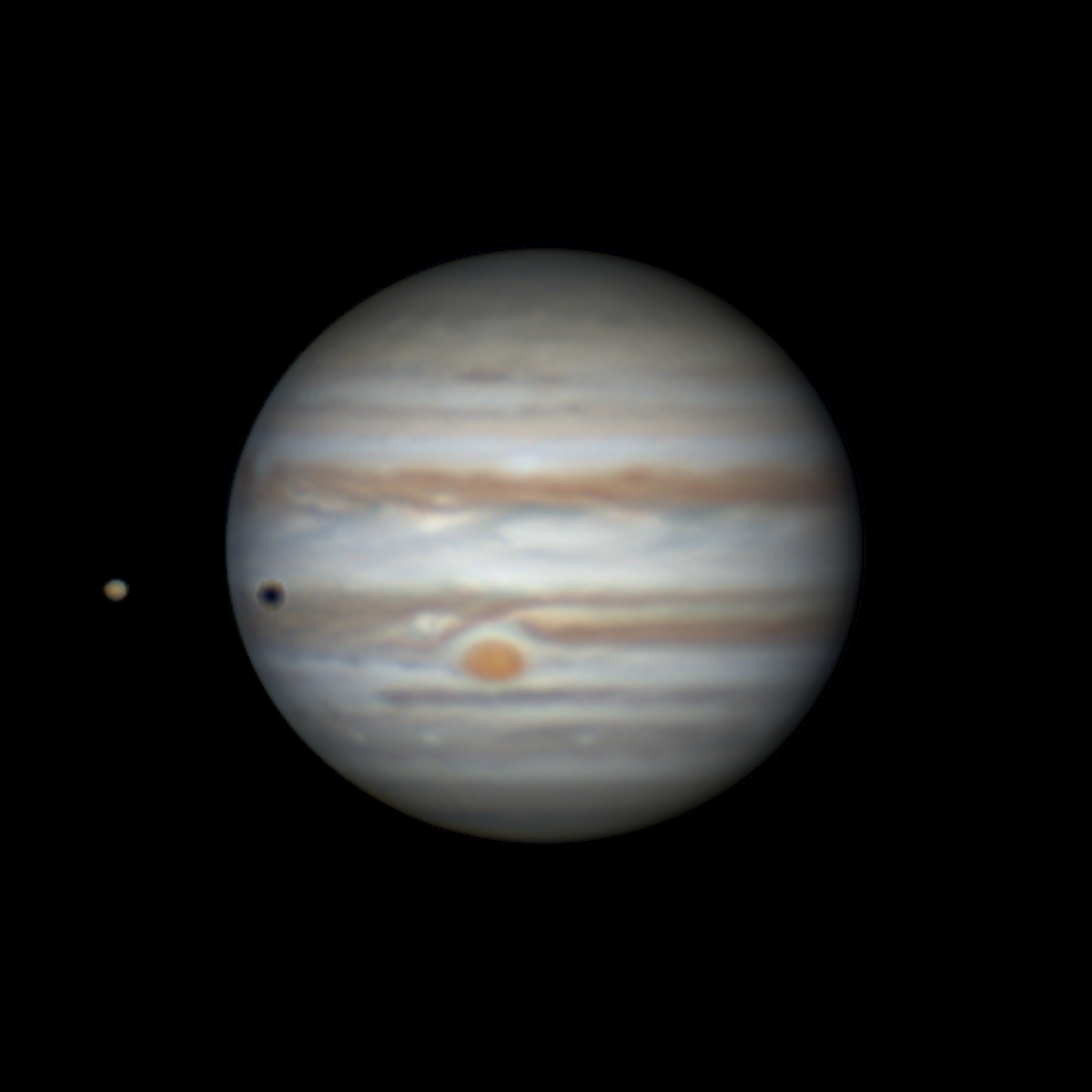 Am Abend des 15. Dezember 2025 konnte ich zwischen 20:32 Uhr und 22 Uhr den Planeten Jupiter aufnehmen. Das Seeing war nicht perfekt; der Große Rote Fleck und der Jupitermond Io mit seinem Schatten waren aber dennoch zu sehen. Insgesamt wurden für das Bild 43 Videos mit jeweils 90 Sekunden Dauer aufgenommen. 15 Prozent der Videobilder konnten zum »Stacken« verwendet werden.