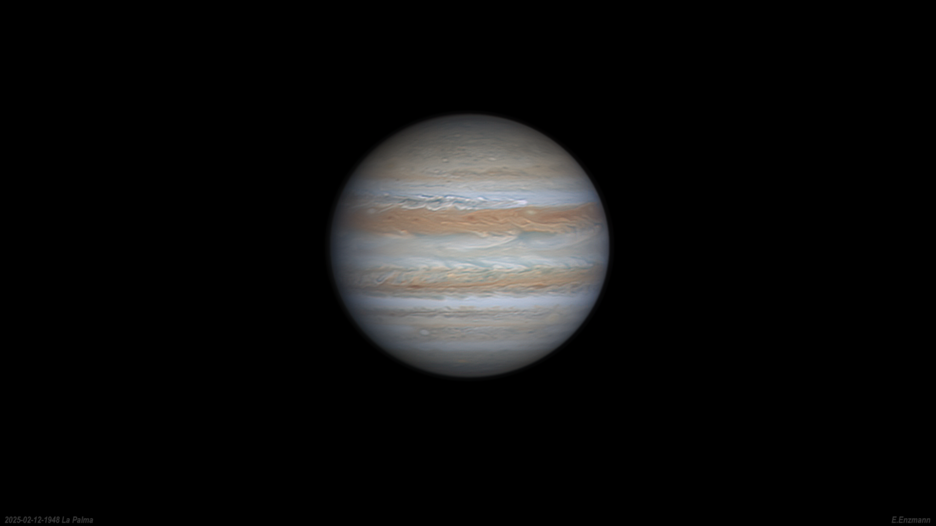 Auf diesem Jupiterbild vom 12. Februar 2025 aus La Palma ist der Ausbruch schön zu sehen. Große Mengen an dunkler Materie sind oberhalb vom großen braunen Band hinter dem hellen weißen Punkt gut sichtbar.