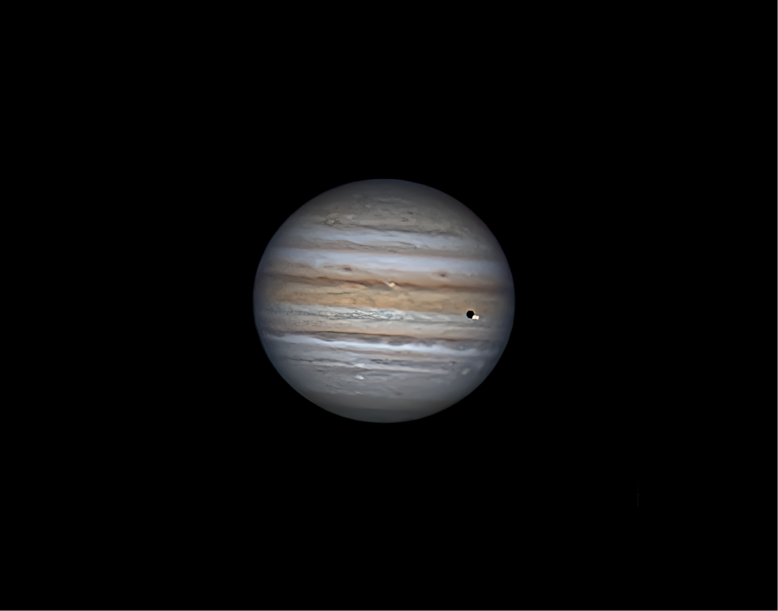 Nur einen Tag nach der Jupiteropposition bedeckt Io noch ihren eigenen Schatten auf Jupiter. Die zwei hellen Flecken auf Io hielt ich erst für Artefakte, erst eine Nachschau auf dem NASA/JPL Solar System Simulator zeigte mir, dass sie durch zwei hellere Gebiete auf der Oberfläche von Io verursacht sind, die lediglich in ihrer Helligkeit durch das Stacken und Schärfen verstärkt sind.