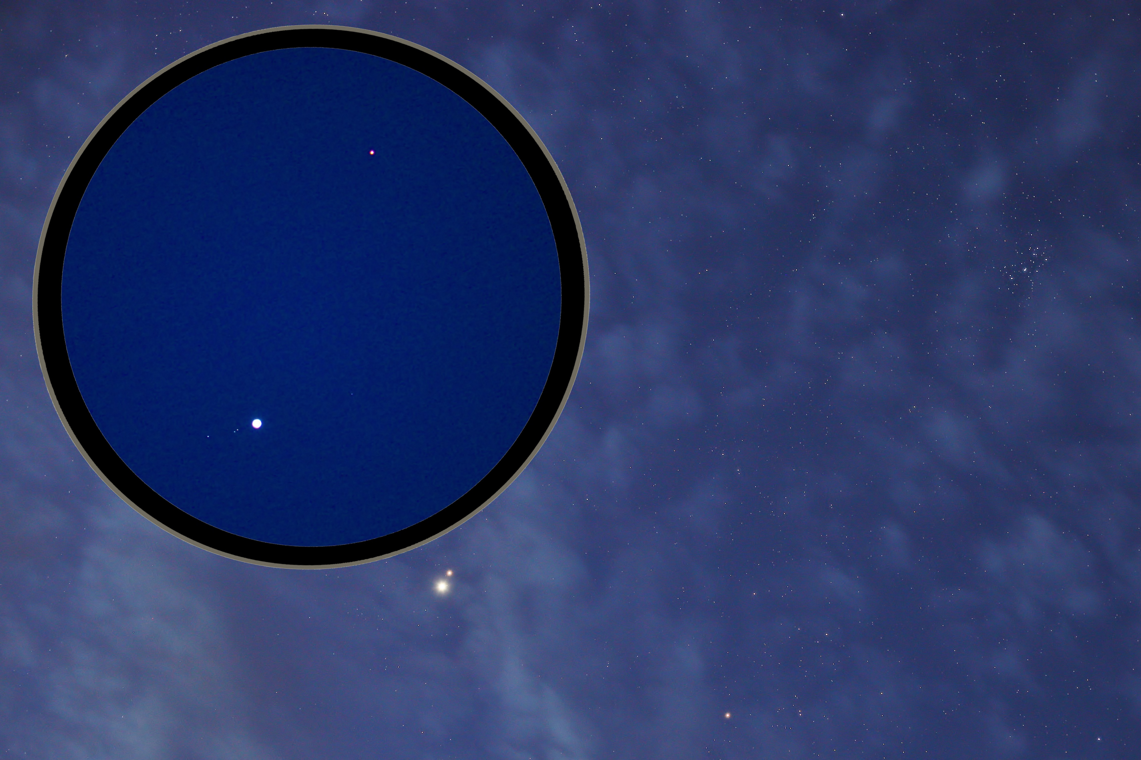 Am 14. und 15. August 2024 bildeten Jupiter und Mars am Morgenhimmel ein herrliches Doppelgestirn, als sie sich in einem Abstand von weniger als 30 Bogenminuten (ein Monddurchmesser) passierten. Das Schauspiel fand, wie die Übersichtsaufnahme zeigt, im Sternbild Stier statt, mit dem Siebengestirn am rechten Bildrand und Aldebaran mit den Hyaden am rechten unteren Bildrand. Das runde Bild zeigt die beiden Planeten mit Jupiters vier Galileischen Monden im Teleskop.