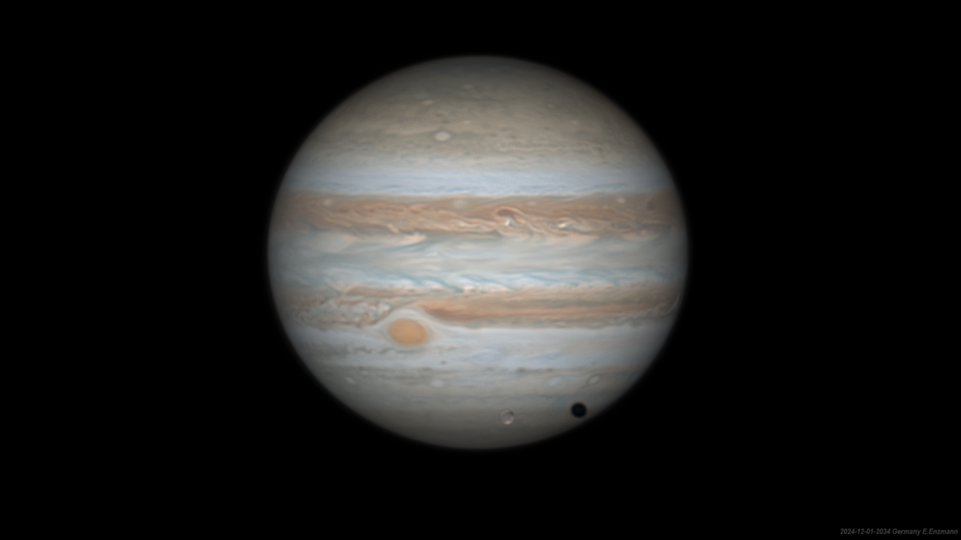 Bei leider nur mittelguten Seeingbedingungen habe ich dieses Bild von Jupiter gemacht. Es zeigt neben dem Roten Fleck noch den größten Jupitermond Ganymed und dessen Schattenwurf auf Jupiter. Das Teleskop wurde dabei off axis benutzt und ein ADC von Gutekunst wurde verwendet.