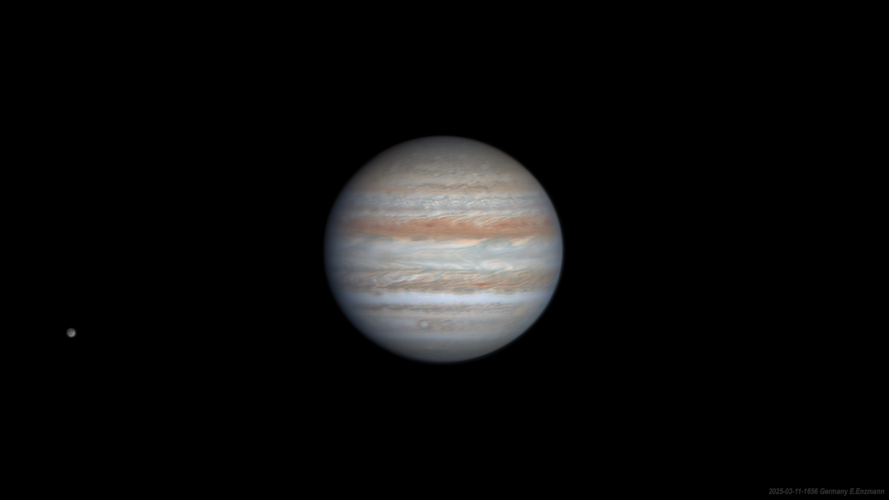 Jupiter mit Mond Ganymed am 11. März 2025 aus Bayern. Sehr ärgerlich war für mich bei dieser Aufnahme zu wissen, es hätte deutlich besser werden können. Der Himmel war an diesem Tag bewölkt, klarte aber zum Sonnenuntergang immer mehr auf. Leider schaute ich immer am Horizont nach Wolken und merkte gar nicht, das es rund um den hoch stehenden Jupiter wolkenlos war. Als ich dies bemerkte, beeilte ich mich, das Teleskop so schnell wie möglich einsatzbereit zu haben. Die ersten Aufnahmen waren dank des überraschend gutem Seeing recht gut und detailreich, aber leider zog ein großes Wolkenband auf und erlaubte nur vier Bilder. Das ist zu wenig, um ein gutes rauschfreies Bild zu machen und deswegen musste ich hier stärker das Rauschen entfernen, was immer mit einem Detailverlust einhergeht. Zur Aufnahme wurde das Teleskop auf 400 mm Öffnung reduziert und ein Gutekunst ADC kam zum Einsatz.