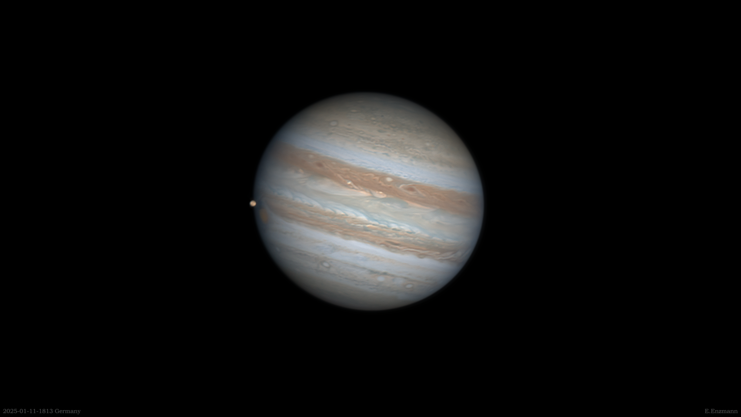 Jupiter aus Bayern vom 11. Januar 2025 mit Mond Io, der sich gerade am Rand halb vor die Planetenscheibe schiebt. Sehr nah dran der Rote Fleck ganz am Rand von Jupiter.