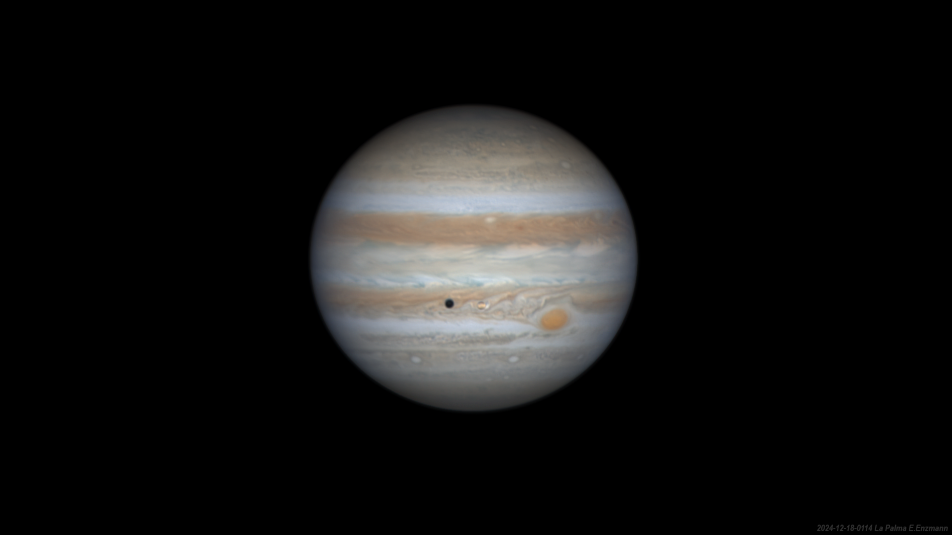 Diese Aufnahme die unter recht mäßig gutem Seeing entstanden ist, zeigt Jupiter, seinen Mond Io und dessen Schatten sowie den Großen Roten Fleck. 21 Videos wurden off axis mit je 120 Sekunden aufgenommen.