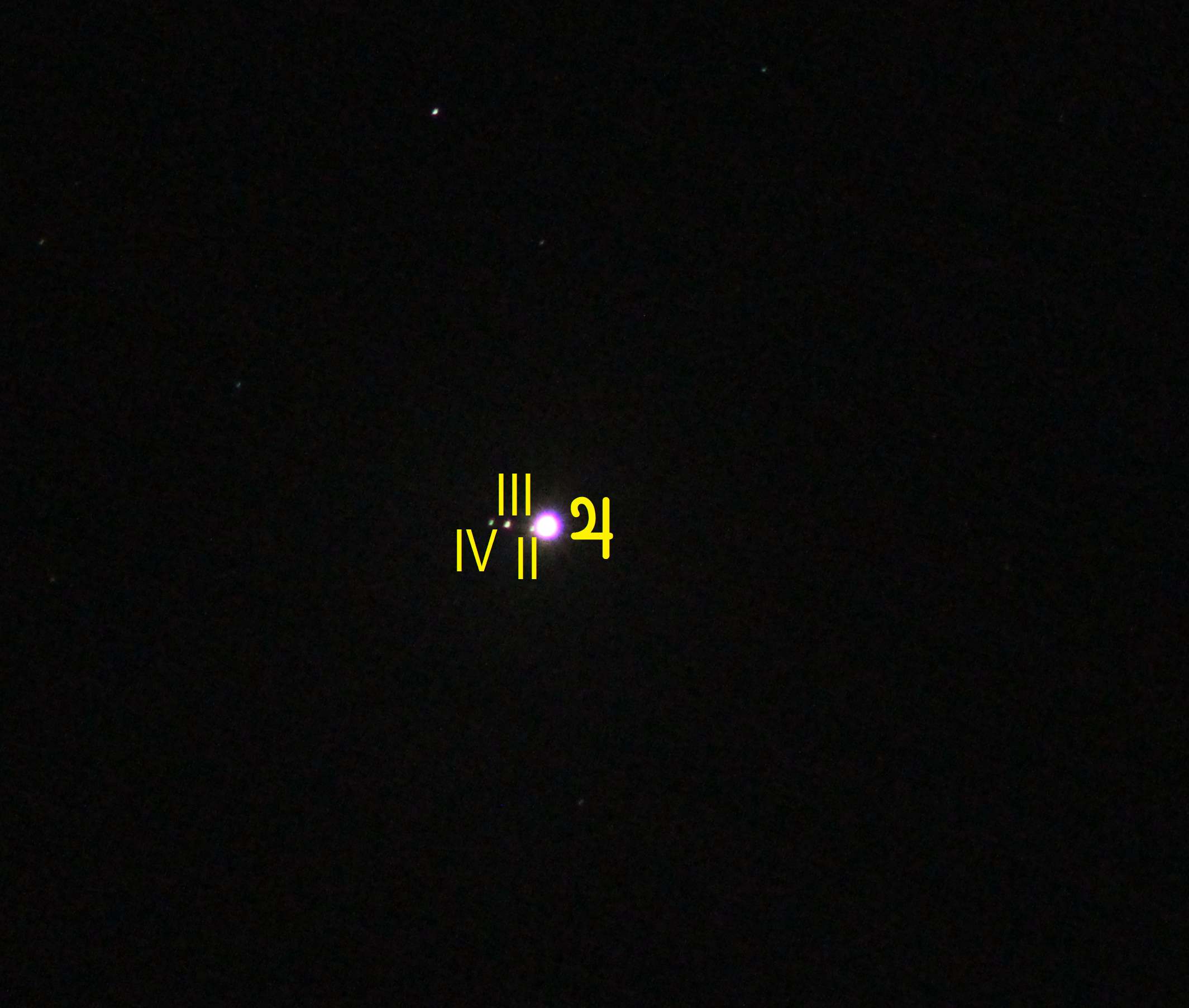 II - Europa; III - Ganymed; IV - Kallisto; Io (I) steht sehr nahe an Jupiter und wird auf diesem Bild von diesem überstrahlt.