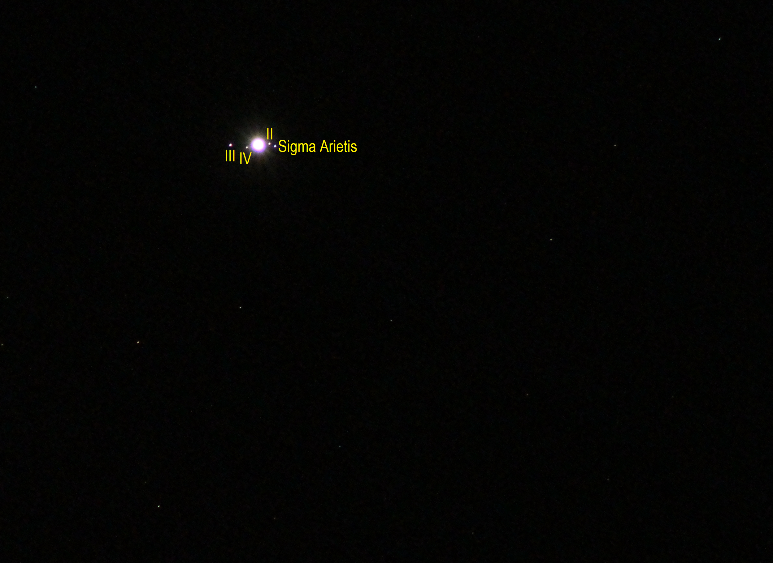 II - Europa; III - Ganymed, IV - Kallisto; Io (I) isteht sehr nahe an Jupiter und wird auf von diesem überstrahlt. Dafür täuscht der 5,5 mag helle Fixstern Sigma Arietis einen vierten Jupitermond vor!