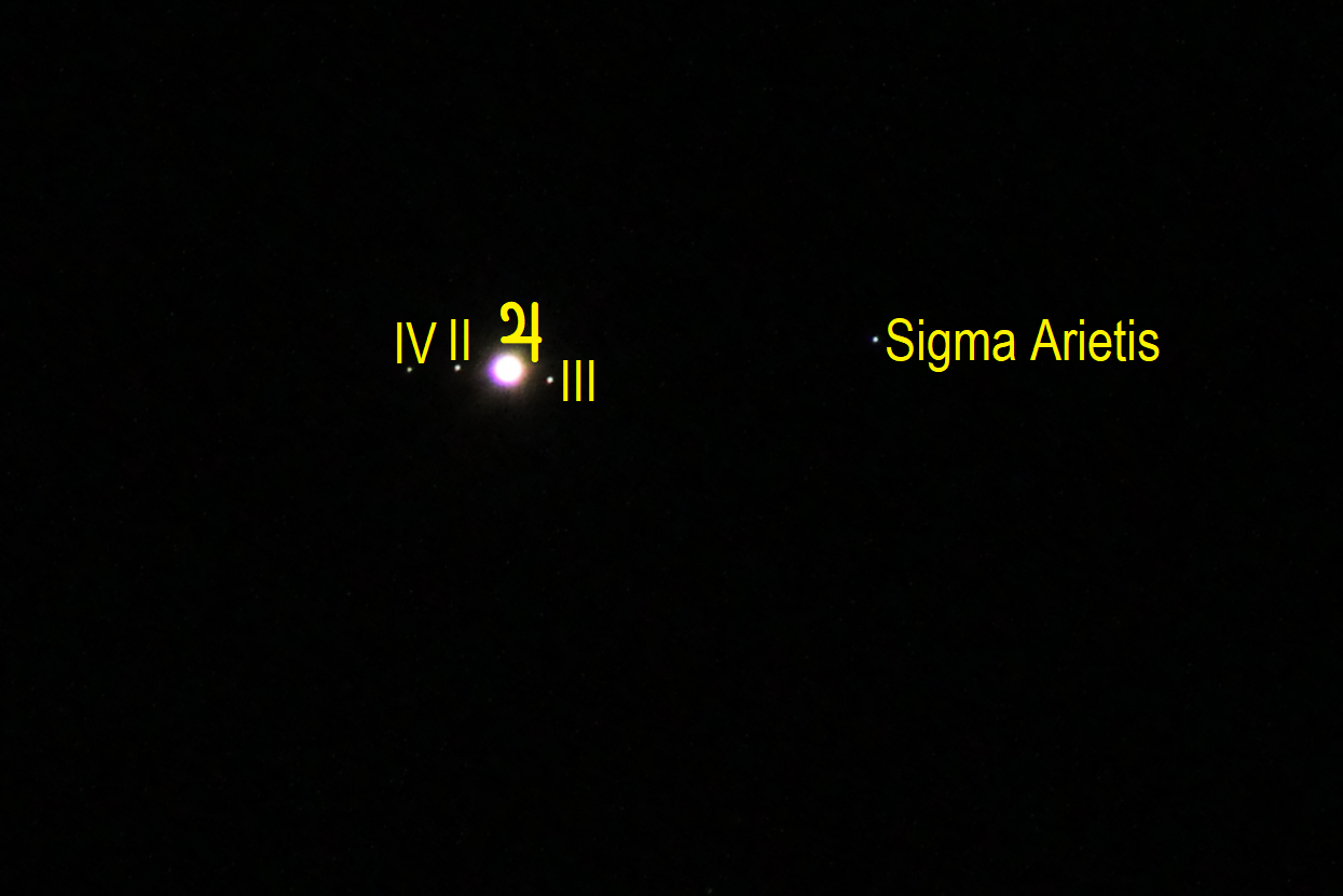 II - Europa; III - Ganymed; IV - Kallisto; Io (I) steht sehr nahe an Jupiter und wird auf diesem Bild von ihm überstrahlt.