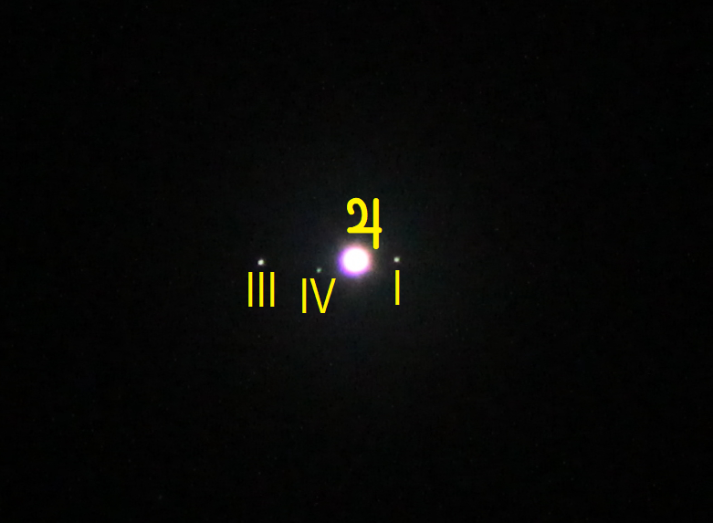 Jupiter mit Monden bei aufziehenden Wolken. I - Io; III - Ganymed; IV - Kallisto; Europa (II) steht sehr nahe an Jupiter und wird auf diesem Bild von ihm überstrahlt.