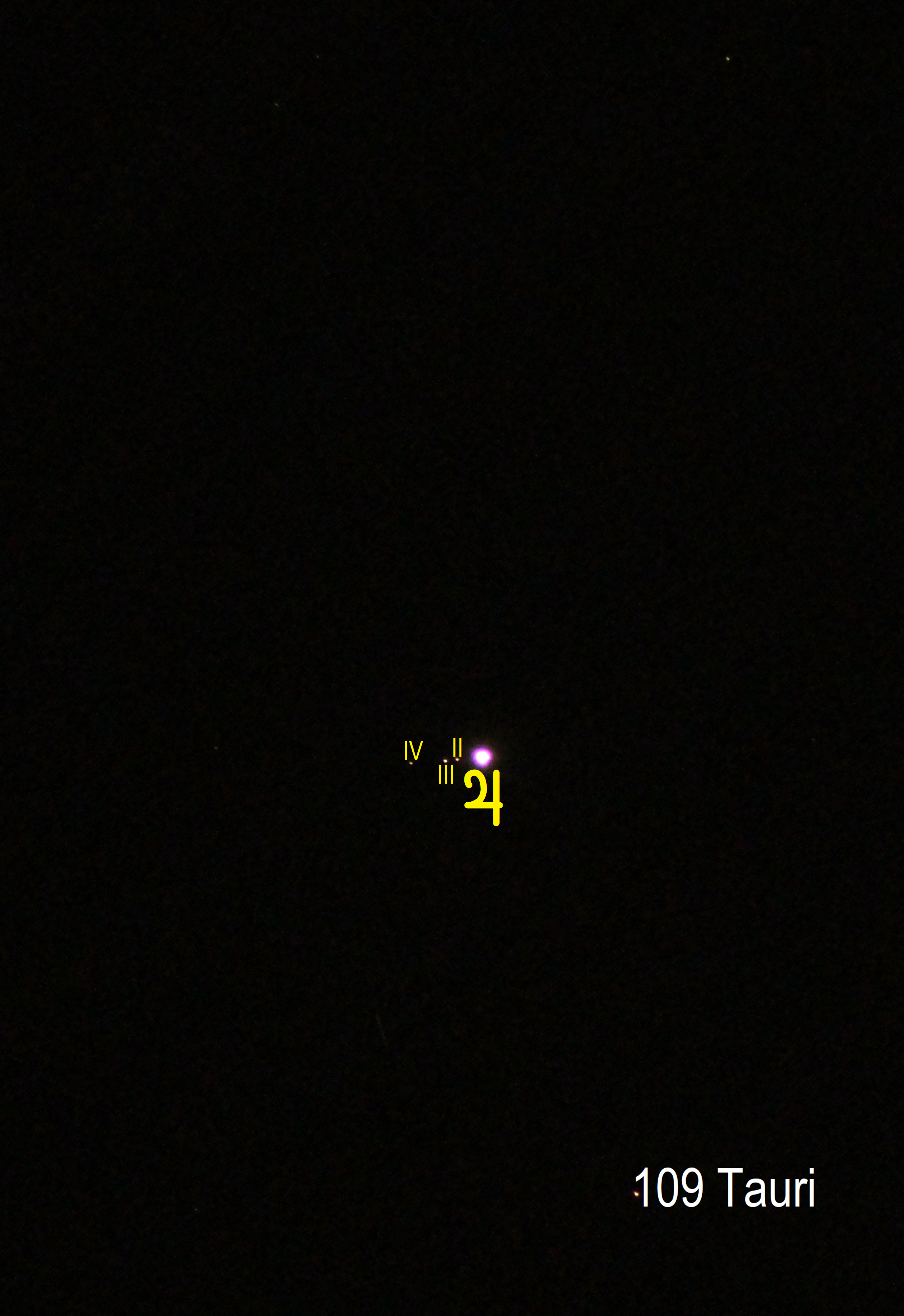 II - Europa. III - Ganymed, IV - Kallisto. Io (I) steht nahe an Jupiter und wird von diesem überstrahlt.