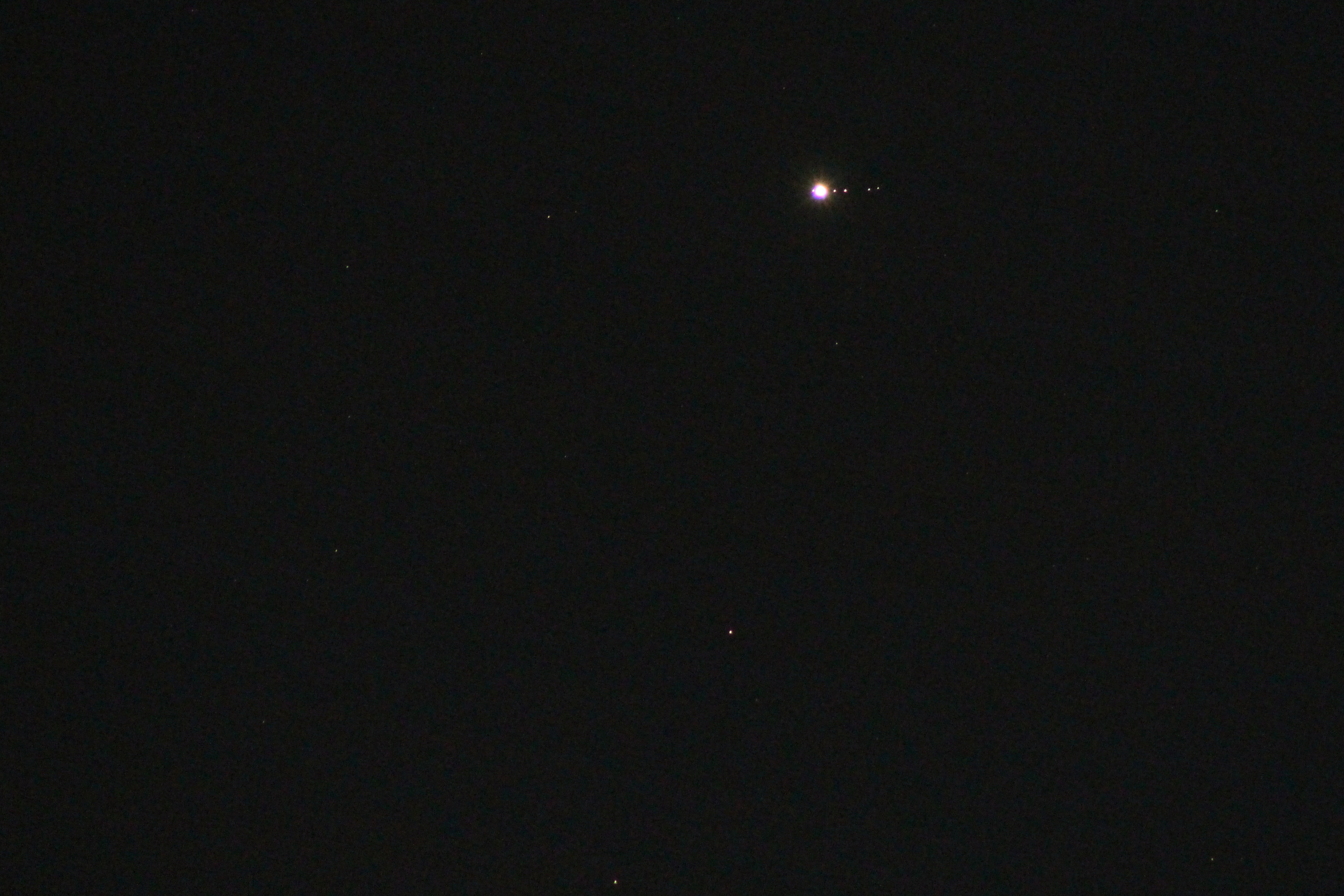 Jupiter mit Monden, fotografiert mit einem Teleobjektiv. Links von Jupiter ist Io, auf der rechten Seite folgen von links nach rechts Europa, Ganymed und Kallisto. Rechts von Kallisto erkennt man den Fixstern HD 210845.