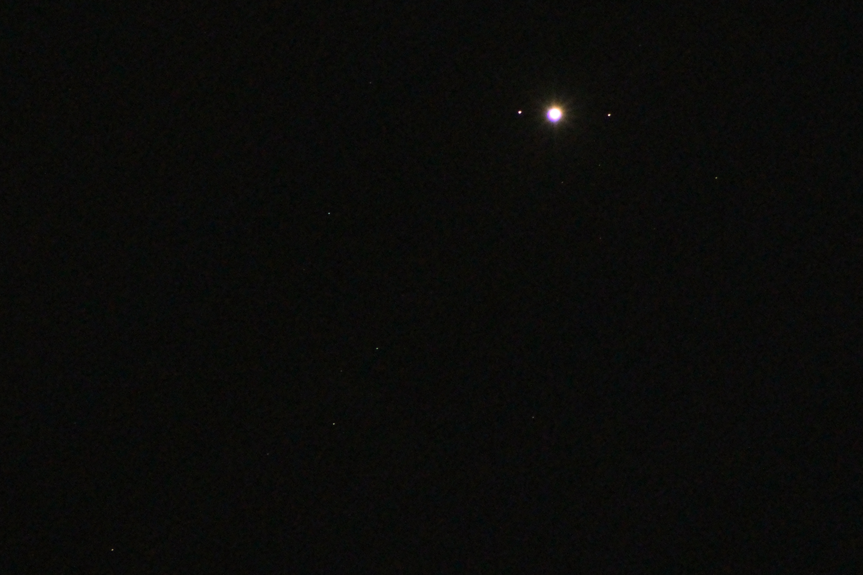 Jupiter mit zwei Monden. Links von Jupiter erblickt man Ganymed und rechts von ihn findet man Kallisto. Io und Europa stehen so nahe am Riesenplaneten, dass sie von diesen überstrahlt werden.
