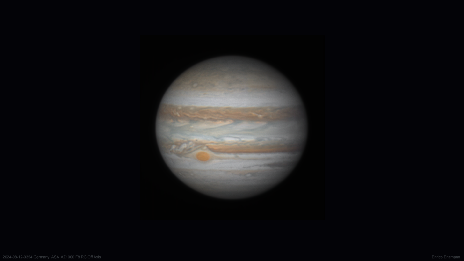Das Seeing war nicht ganz so gut wie am Vortag, siehe das Jupiterbild vom 11. August 2024. Aber ein paar schöne Details sind im Bild vom 12. August ebenfalls sichtbar. Beim Processing habe ich mich etwas gewundert. Ich kann mich nicht erinnern das der Rote Fleck schon mal so klein war.Es wird die nächsten Jahre spannend, weil nicht ausgeschlossen werden kann das er sich komplett auflöst. Die Aufnahme ist off axis mit 335 mm Öffnung gemacht.