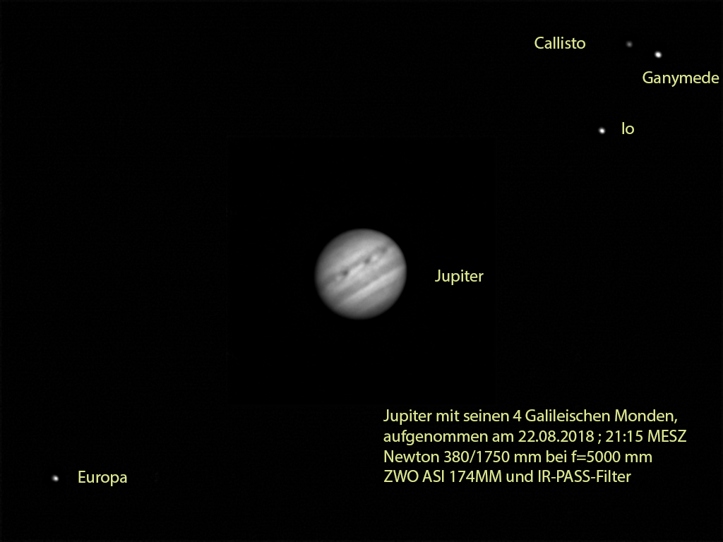 Am Abend des 22. August 2018 war die Luft ausreichend ruhig, um Videos des Planeten Jupiter mit seinen vier großen Monden aufzunehmen. Ein ähnliches Bild mag sich vor mehr als 400 Jahren Galileo Galilei beim Blick durch sein einfaches Fernrohr geboten haben.