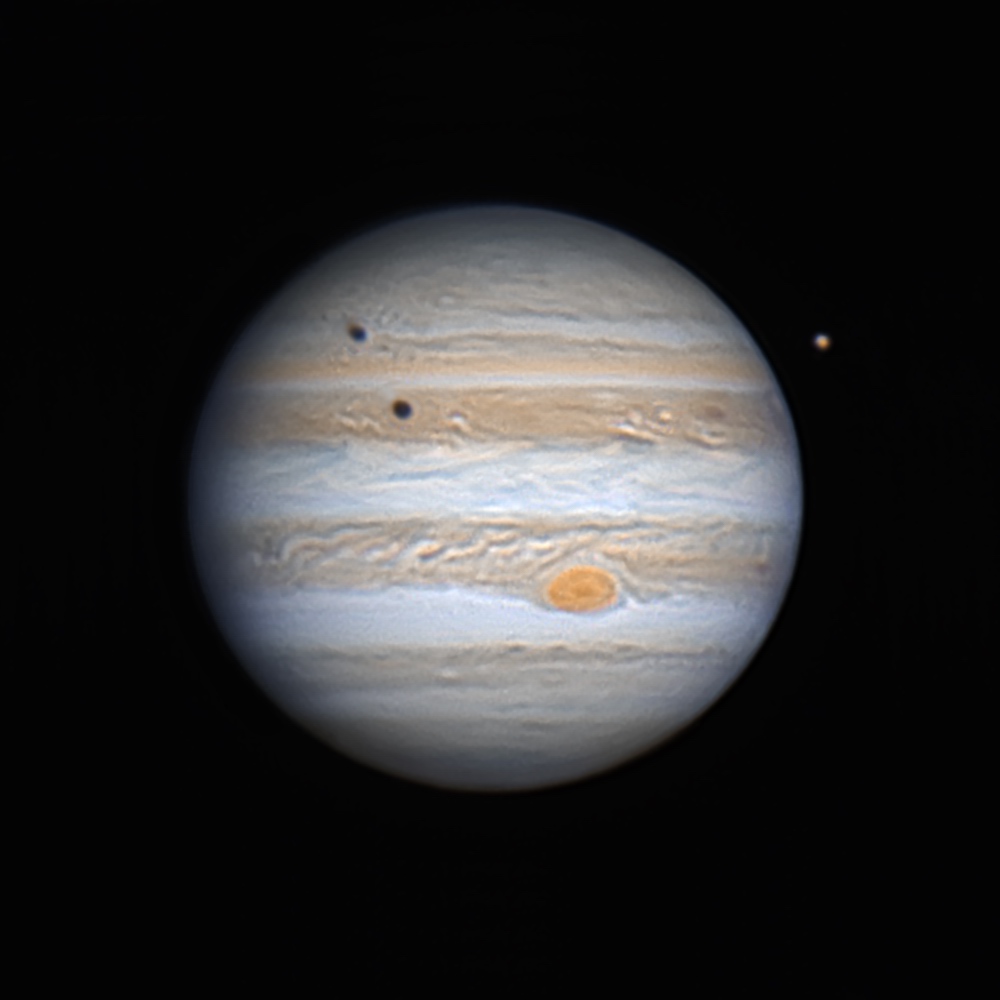 Am 5. Juni 2017 gab es wohl die letzte Chance in diesem Jahr für eine interessante Konstellation am Jupiter. Gleich zwei Monde (Io und Europa) warfen ihre Schatten auf den Planeten und gleichzeitig war auch noch der GRF gut sichtbar. Bilder aus sieben Filmen mit je ca. 5000 Einzelbildern wurden mit WinJUPOS zu einem Gesamtbild "gedreht". Das schien mir die einzige Möglichkeit bei dieser niedrigen Stellung des Planeten und dem mäßigen Seeing etwas brauchbares herauszuholen.