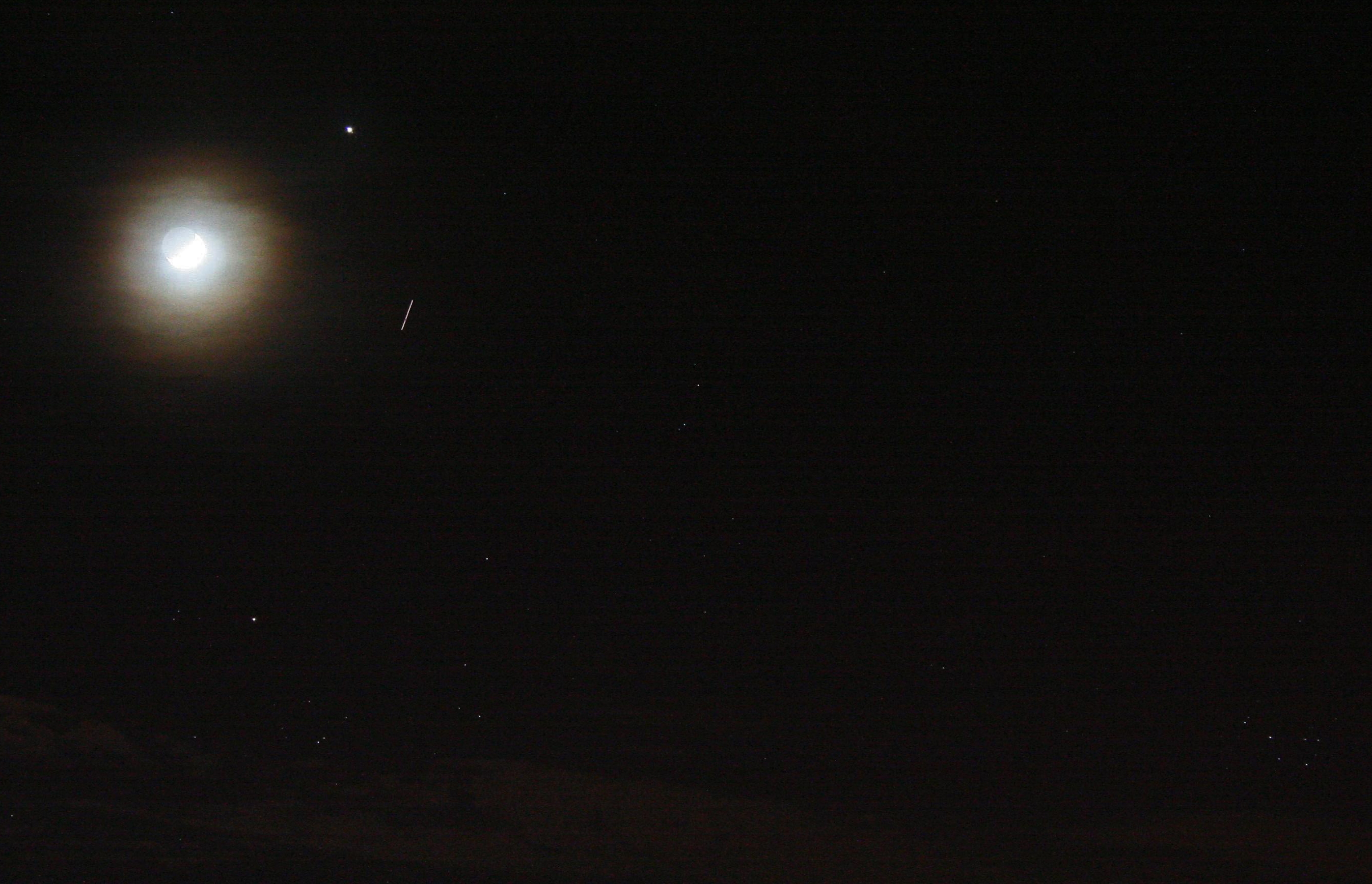 Am Abend des 14. April 2013 begegneten sich nicht nur Mond und Jupiter bei den Hyaden, auch die Internationale Raumstation (ISS) flog zufällig dort vorbei. In der rechten unteren Ecke des Bildes erkennt man noch die Plejaden. Der Mond mit seinem Hof ist überbelichtet, aber sonst wären kaum Sterne zu sehen.