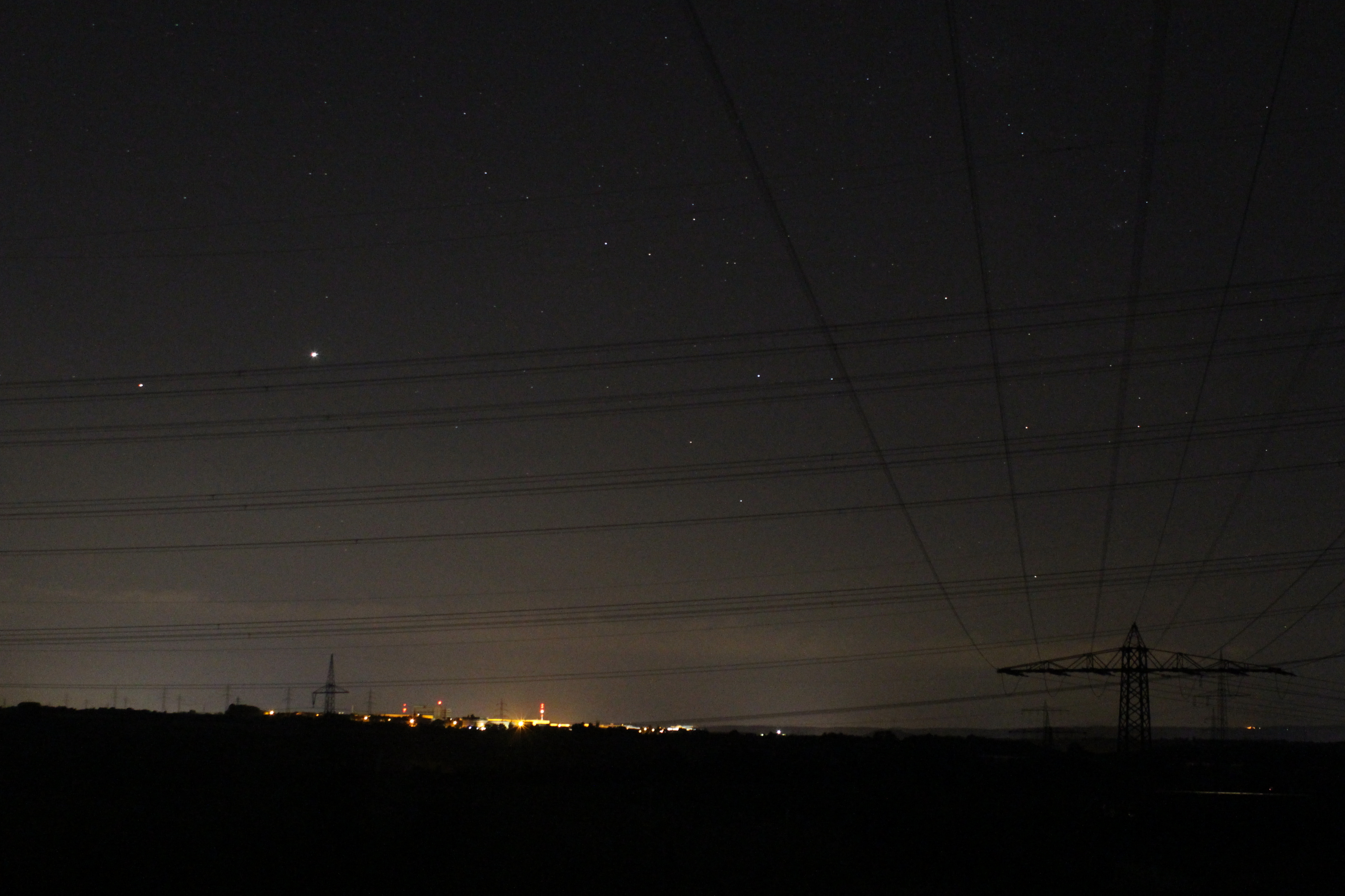 aufgenommen nördlich des Umspannwerks Pulverdingen, weshalb man im Vordergrund einige zu diesem Umspannwerk führende Hochspannungsleitungen erkennen kann. In der Ferne erkennt man auch den Stuttgarter Fernsehturm und den Stuttgarter Fernmeldeturm.