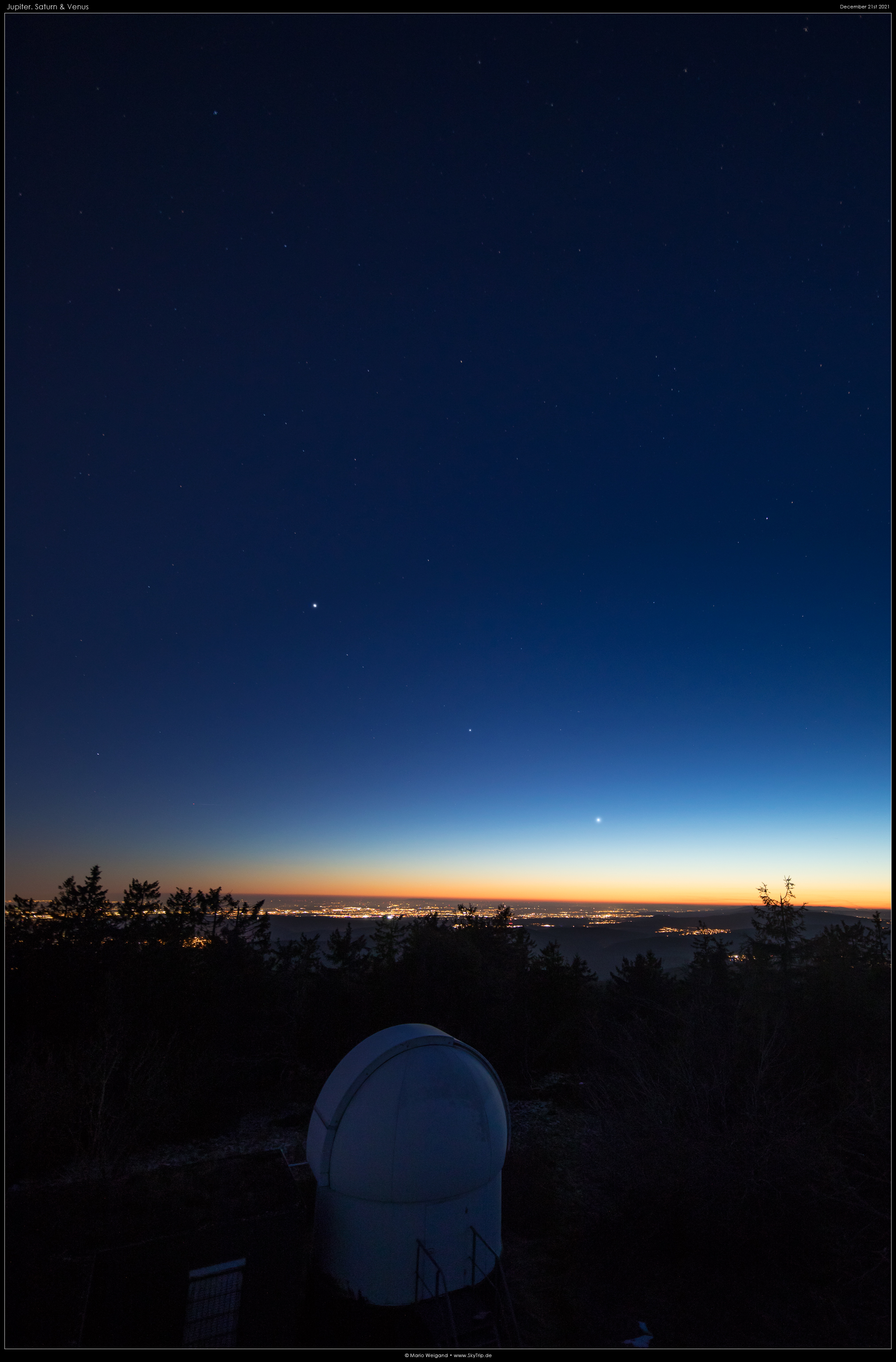 Als "Trostpreis" für eine vergebliche Suche nach Komet Leonard tief am Horizont, standen die Planeten Jupiter, Saturn und Venus aufgereiht inmitten der tollen Dämmerungsfarben über dem kleinen Feldberg im Taunus. http://www.skytrip.de
