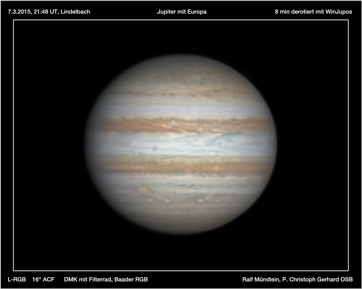 Am 7. März 2015 hatten wir nach längerer Wartezeit gutes Seeing. Trotz der durchziehenden Zirren gelang ein ansprechendes Bild von Jupiter und seinem Mond Europa, der sich vor der Planetenscheibe befand.