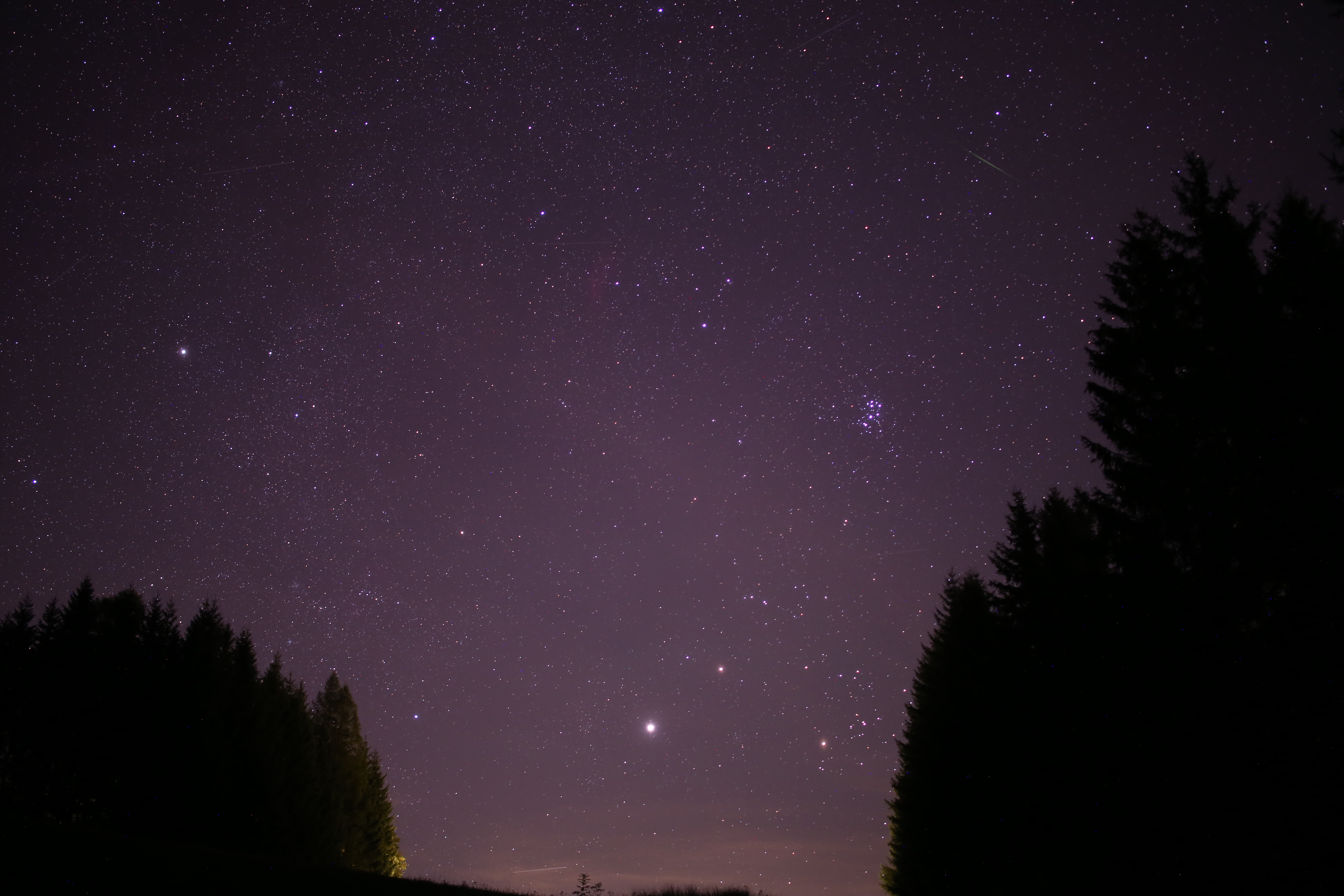 Am Morgen des 7. August 2024 haben sich Jupiter und Mars im Sternbild Stier getroffen. Über dem Osthorizont waren auch die Sternbilder Fuhrmann und Perseus zu sehen. Rechts oben im Bild der Offene Sternhaufen der Plejaden. Man vergleiche diese Aufnahme mit der vom 31. Juli 2024, wo auch die abnehmende Mondsichel das Gruppenbild vervollständigte, Mars aber noch eine deutlich größere Distanz zu Jpiter hatte.