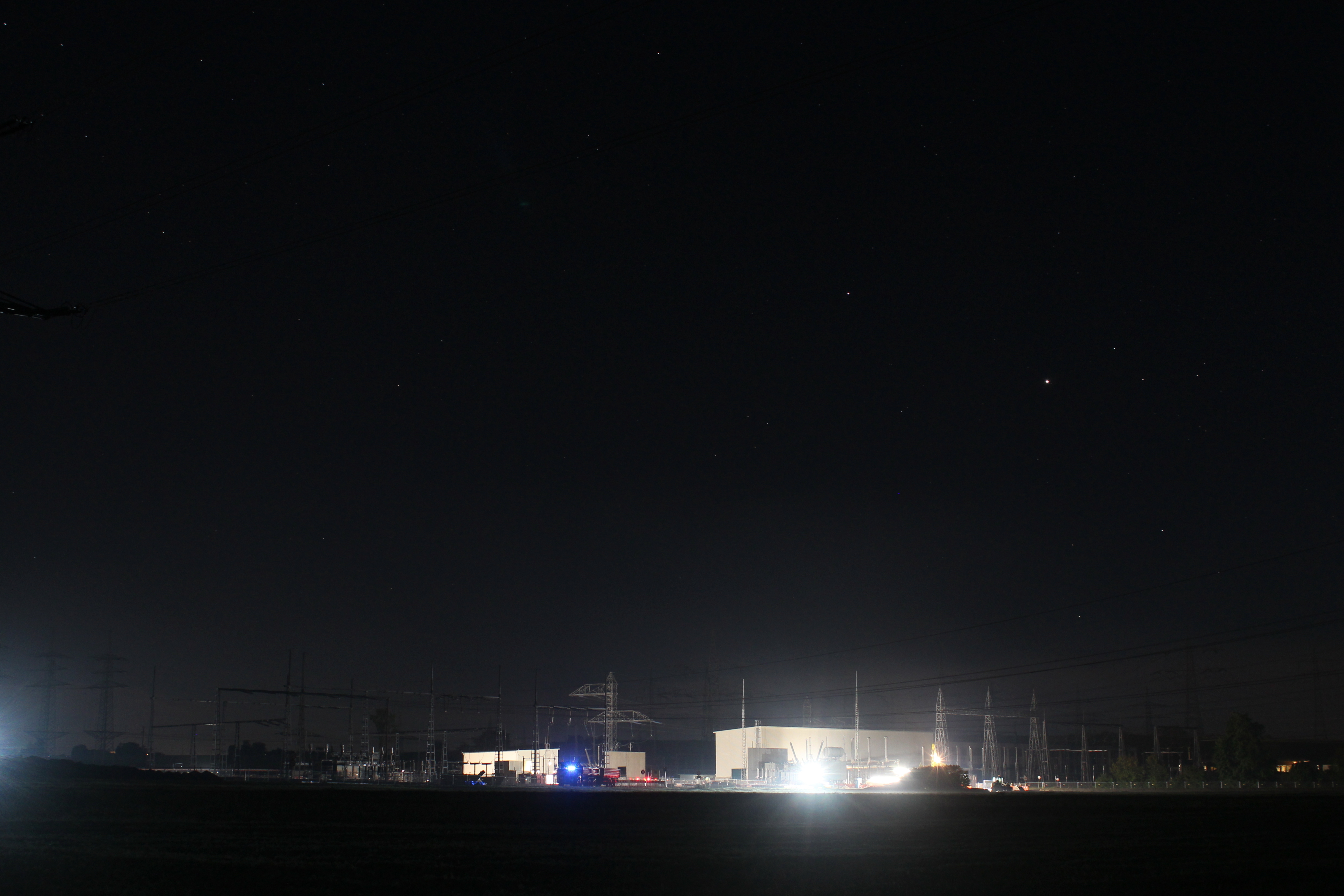 über dem Umspannwerk Grossgartach von TransnetBW. Auf der Straße, die nördlich an diesem Umspannwerk vorbeiführt, war zum Zeitpunkt der Aufnahme eine Nachtbaustelle eingerichtet.