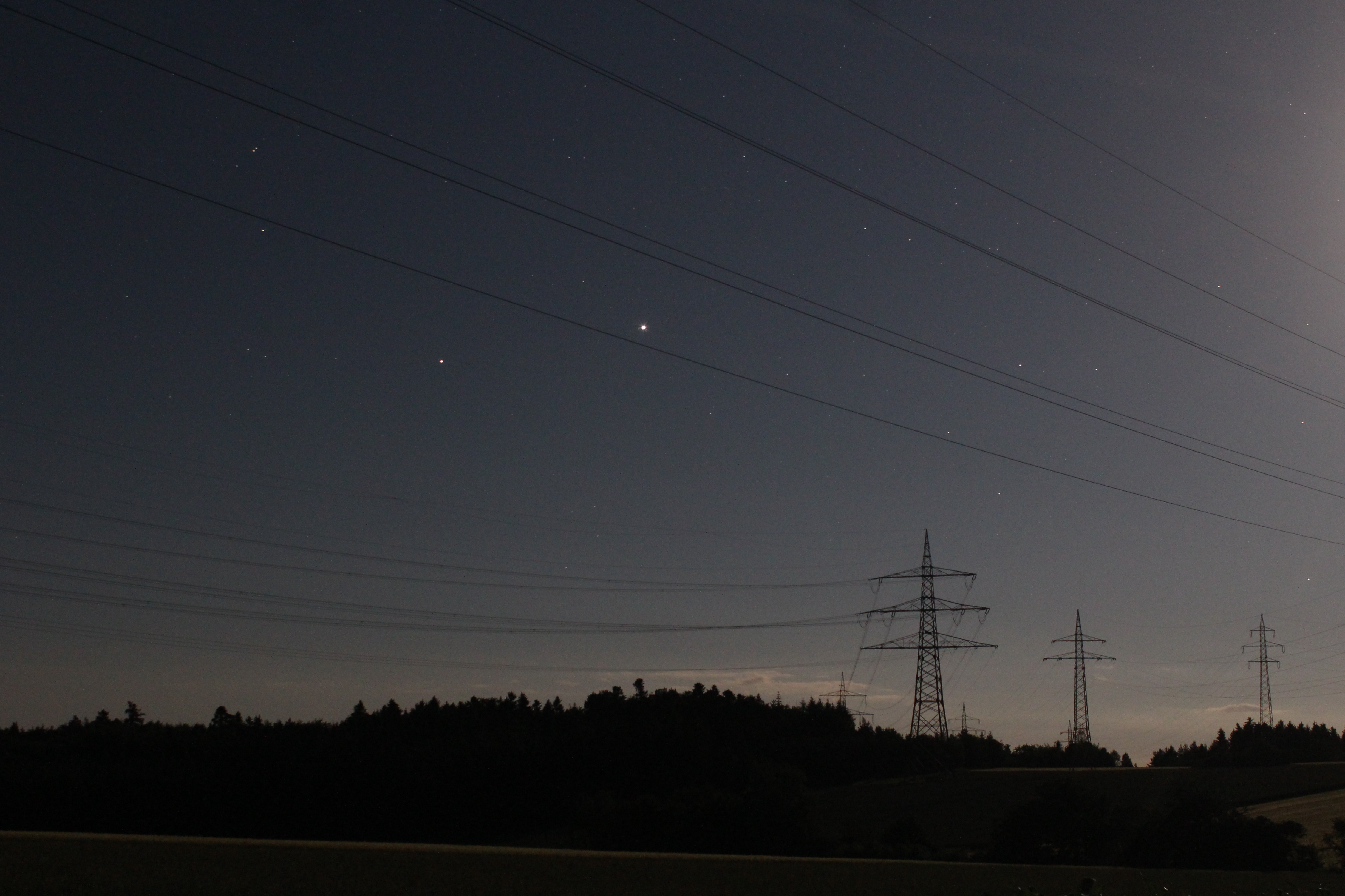 Jupiter und Saturn mit dem zum Umspannwerk Oberjettingen führenden Hochspannungsleitungen im Vordergrund, aufgenommen südlich von Sulz am Eck.