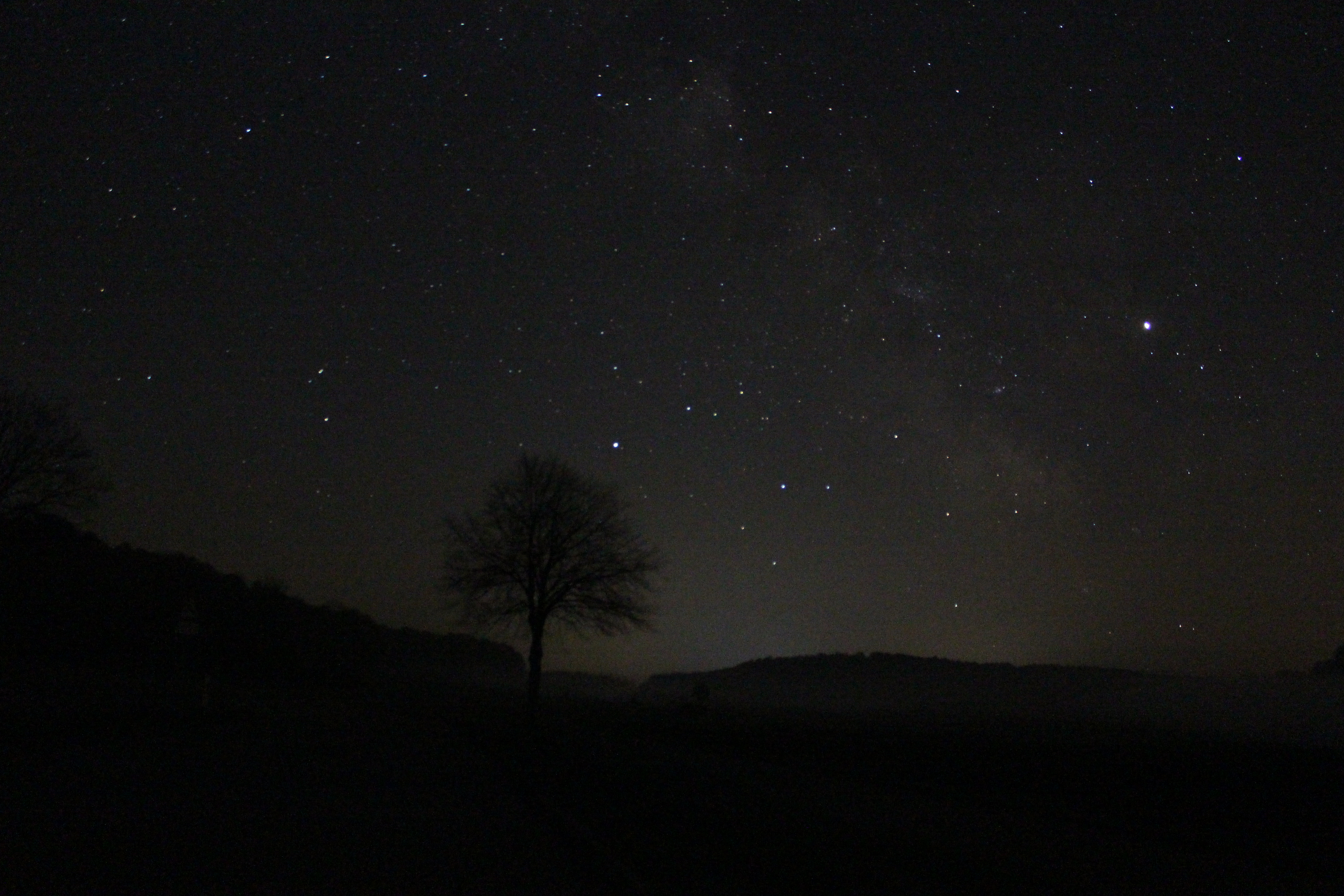 Die Sternbilder Schütze und Schlangenträger mit den Planeten Jupiter und Saturn, der Milchstraße und dem Lagunennebel. Aufgenommen in einer leicht nebligen Nacht auf einem Parkplatz an der B 312 südlich von Engstingen auf der Schwäbischen Alb.