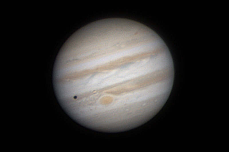 Der riesige Gasplanet Jupiter, hier mit dem "Großen Roten Fleck". Der schwarze Punkt im linken Bereich ist der Schatten des Jupitermonds Io. Der Mond Io schob sich vor die Jupiterscheibe von der Erde aus gesehen am 22. Januar 2014 um 20:33 Uhr MEZ. Die Aufnahme entstand mit einer ZWO ASI 120MC und einer 2,5-fach-Barlow-Linse am Celestron 9.25 von Deutschland (Unna/NRW) aus. Aufgenommen wurden rund 2000 Frames. Bildbearbeitung dann mit Registax 6, Fitswork und Photoshop.