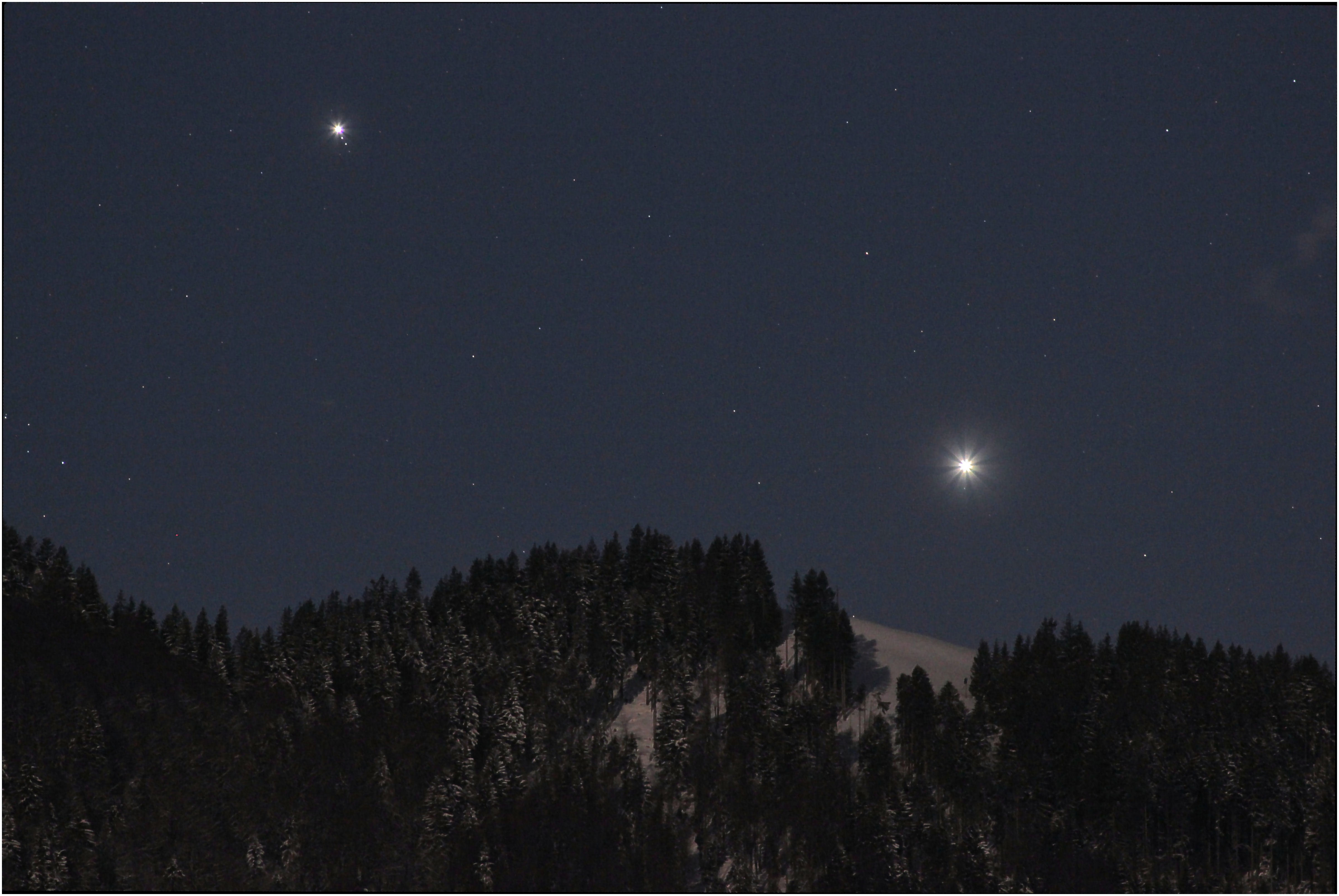 Das Foto zeigt die beiden "Blickfang-Planeten" über dem Blomberg bei Bad Tölz bei Mondlicht.