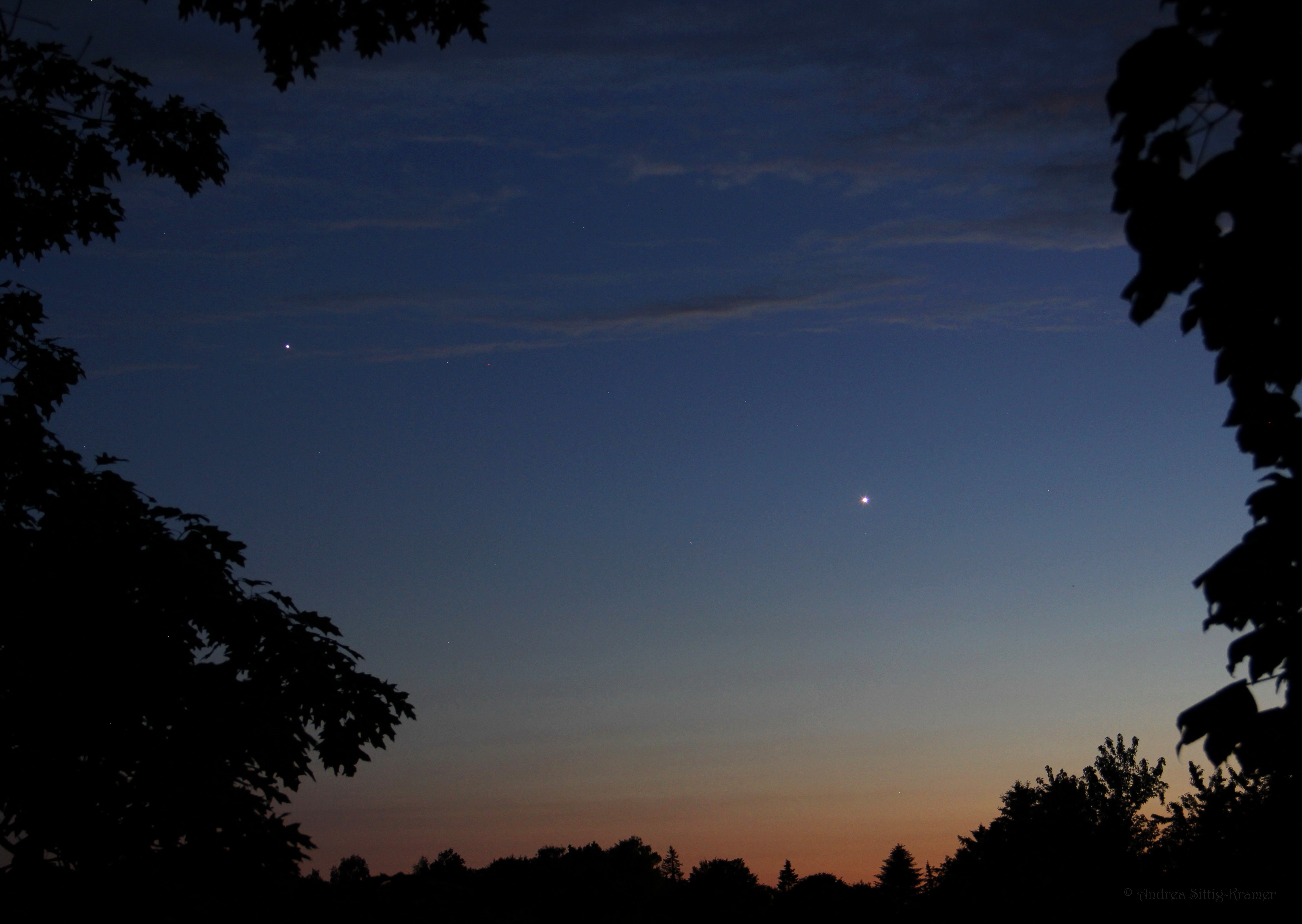 Die beiden hellsten Objekte am Abendhimmel sind zurzeit eindeutig die Venus und der Jupiter. Die -4,5 mag helle Venus (rechts im Bild) bewegt sich bis Ende des Monats auf den -1,9 mag hellen Jupiter (links) zu. Am 1. Juli 2015 werden sich die beiden Planeten in Konjunktion zueinander befinden. Das heißt, sie sind von der Erde aus betrachtet scheinbar sehr eng zusammen. Der "Abendstern" steht dann etwa eine Vollmond-Breite unter dem Jupiter. Bei wolkenfreiem Himmel, wie auf dem Foto am 14. Juni 2015 in Uelzen, ist diese auffällige Planetenkonstellation während und kurz nach Sonnenuntergang nicht nur für Hobby- Astronomen ein atemberaubender Anblick.