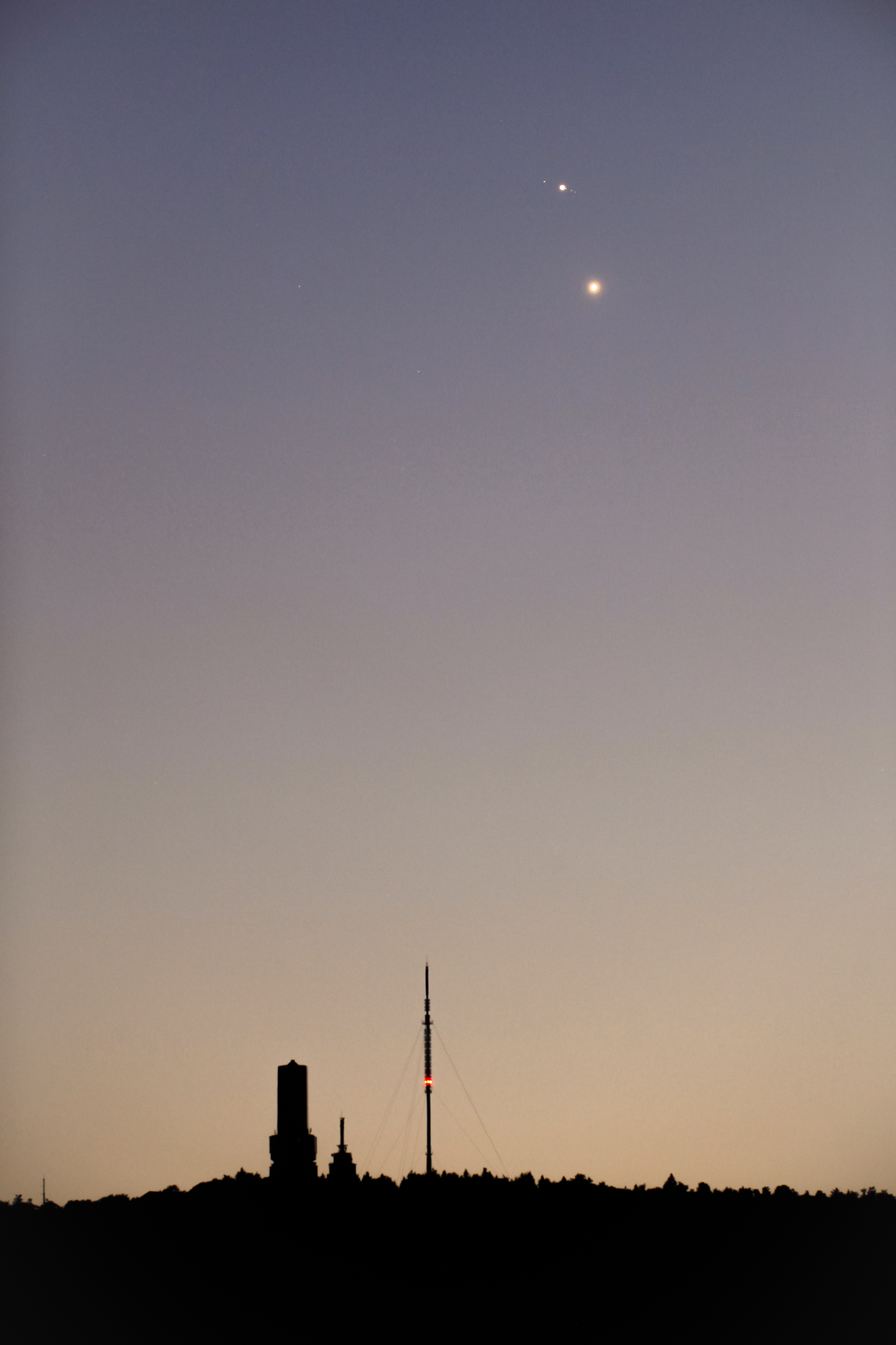 Der 30. Juni 2015 war der große Tag der engsten Annäherung von Jupiter und Venus. Mit Hilfe von Stellarium bestimmte ich den Azimutwinkel der beiden. Mit Google Earth suchte ich mir einen Standort, von dem aus die Planeten neben dem alten Sendeturm auf dem Feldberg im Taunus erscheinen würden. Das Foto zeigt, dass das Vorhaben gelang. Sogar die vier Galileischen Monde sind erkennbar!