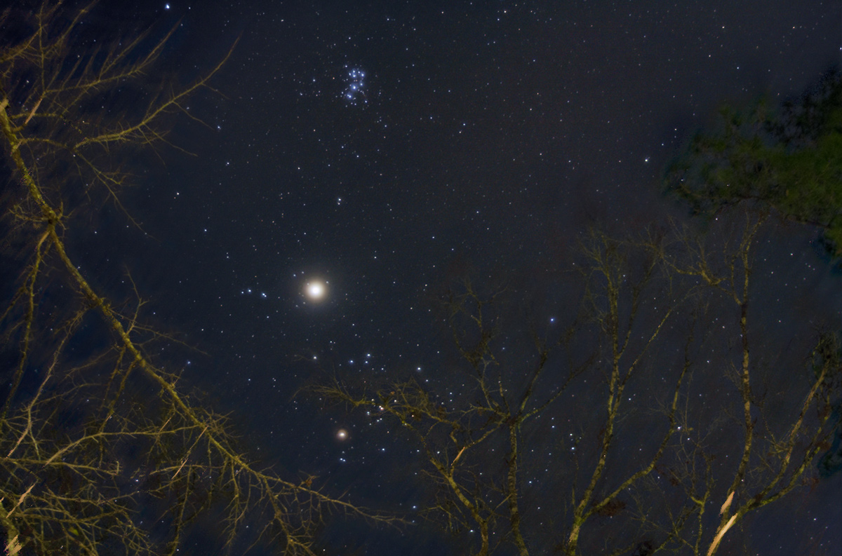 Jupiter, Vesta, Hyaden und Plejaden fand ich nach Einbruch der Nacht über den Baumkronen in Texas. Kurz entschlossen legte ich die Kamera in einen Gartenstuhl und machte 20 kurz belichtete Aufnahmen, die ich zu einem stimmungsvollen Summenbild verarbeiten konnte.