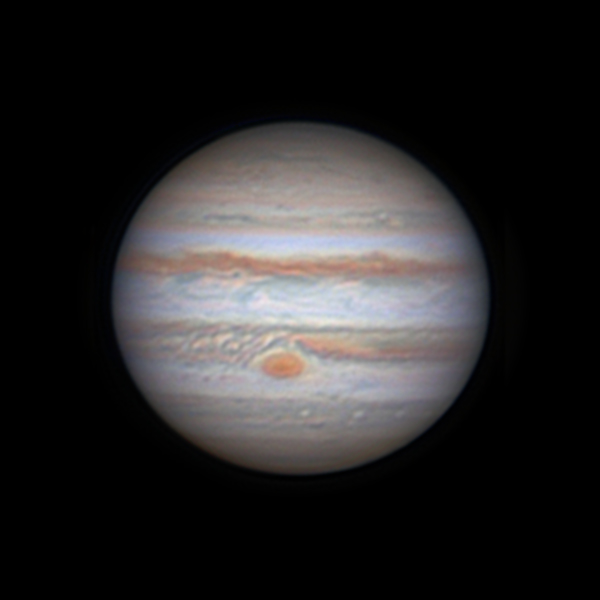 Am Abend des 10. Januar 2014 hatte ich eine selten ausgezeichnete Luftruhe für meinen Standort. Mit einem Sieben-Zoll-Meniscas konnte ich mit Hilfe einer Barlowlinse Jupiter kurz nach seiner Opposition festhalten. Die Einzelheiten in den verschiedenen Wolkenbändern und selbst im Großen Roten Fleck haben mich schon bei der ersten Bearbeitung des Bilds beeindruckt.