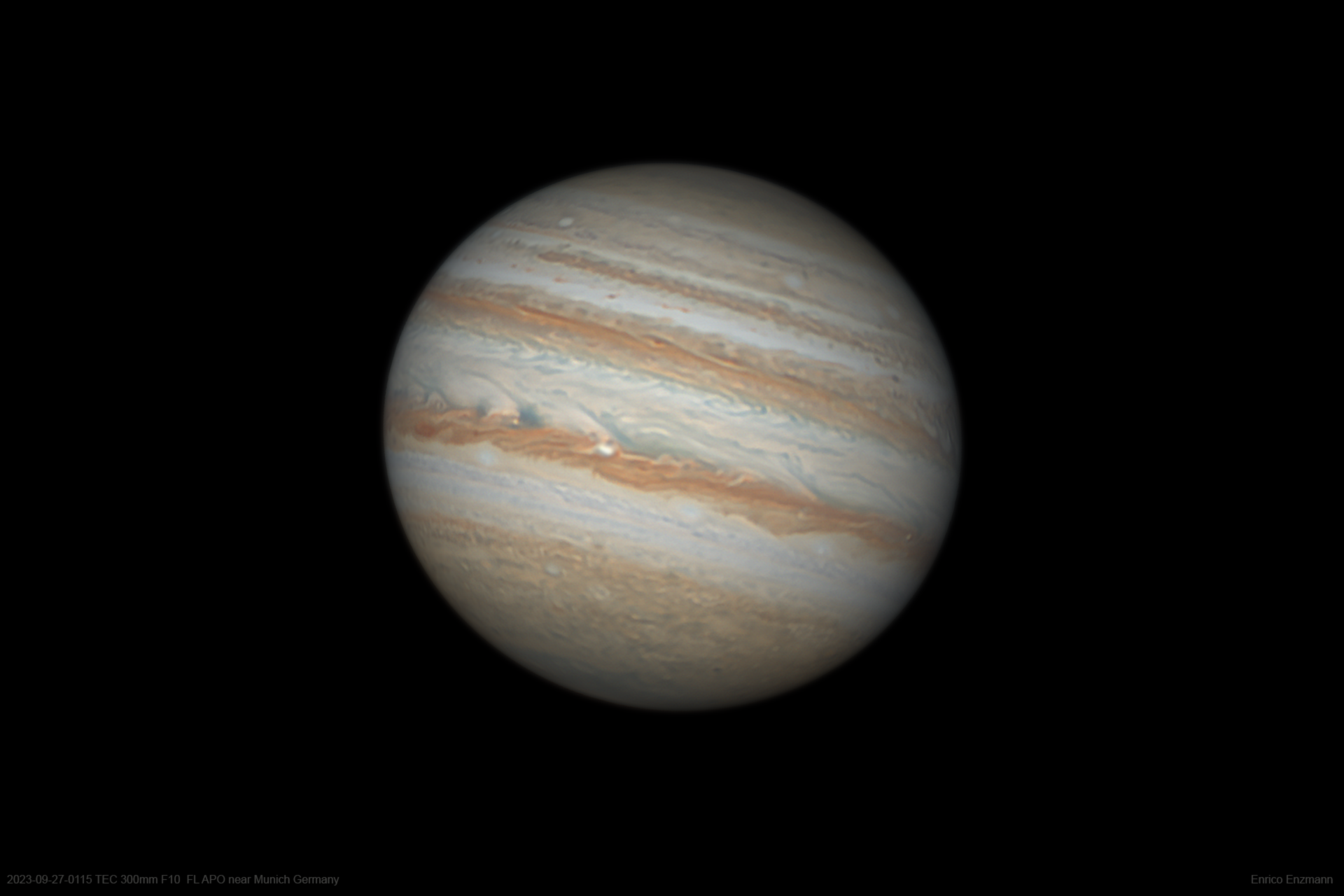 Dieses mit dem verbesserten WinJUPOS-Derotations-Programm neu gerechnete Bild besteht aus insgesamt 163200 Einzelbildern: Innerhalb von 148 Minuten wurden Videos mit je 60 Sekunden Länge aufgenommen, davon 102 gute selektiert und nach der Lucky-Imaging-Technik bearbeitet. Hierzu sind pro Bild 1600 Einzelbilder von einer Minute Videoaufnahme hergenommen worden. Obwohl die Seeing-Bedingungen nur mittelmäßig waren, ist ein gutes recht natürlich aussehendes Bild herausgekommen.