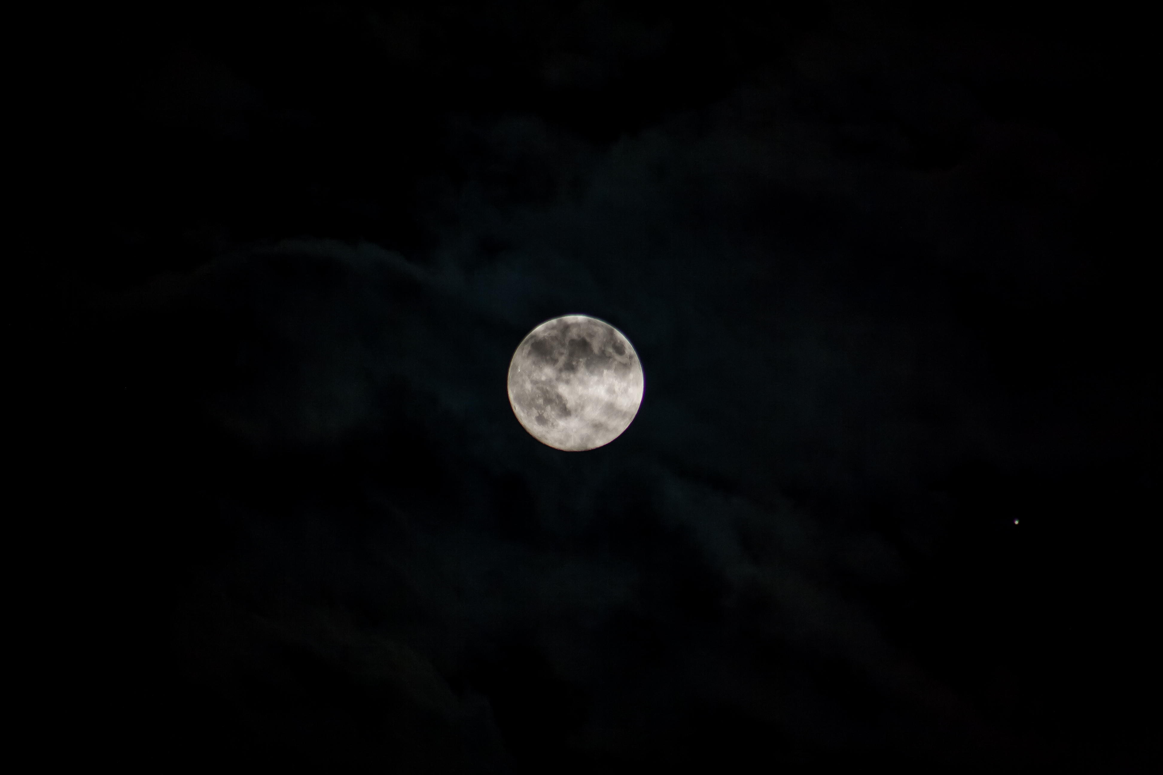 Knapp elf Stunden vor Vollmond wanderte der Mond an Jupiter vorbei. Das Treffen der beiden wurde leider durch reichlich Wolken begleitet. Ab und zu bot sich dann mal eine kleine Wolkenlücke an, um dieses Treffen auch auf Bild festzuhalten. (Abstand: 1,8° / Sonnenhöhe: -11,7°)