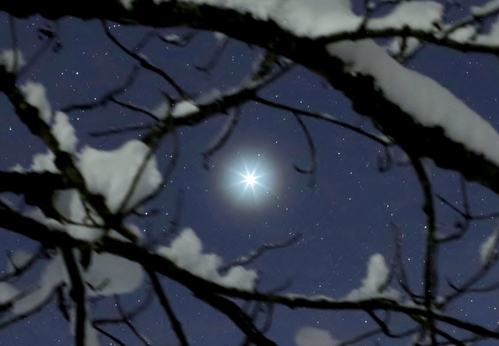 Üppiger Schneefall Anfang Dezember, darauf eine klare Nacht mit Minustemperaturen und Mondlicht, das bereitete die Bühne für dieses weihnachtlich wirkende Portrait von Jupiter als Weihnachtsstern 2023.