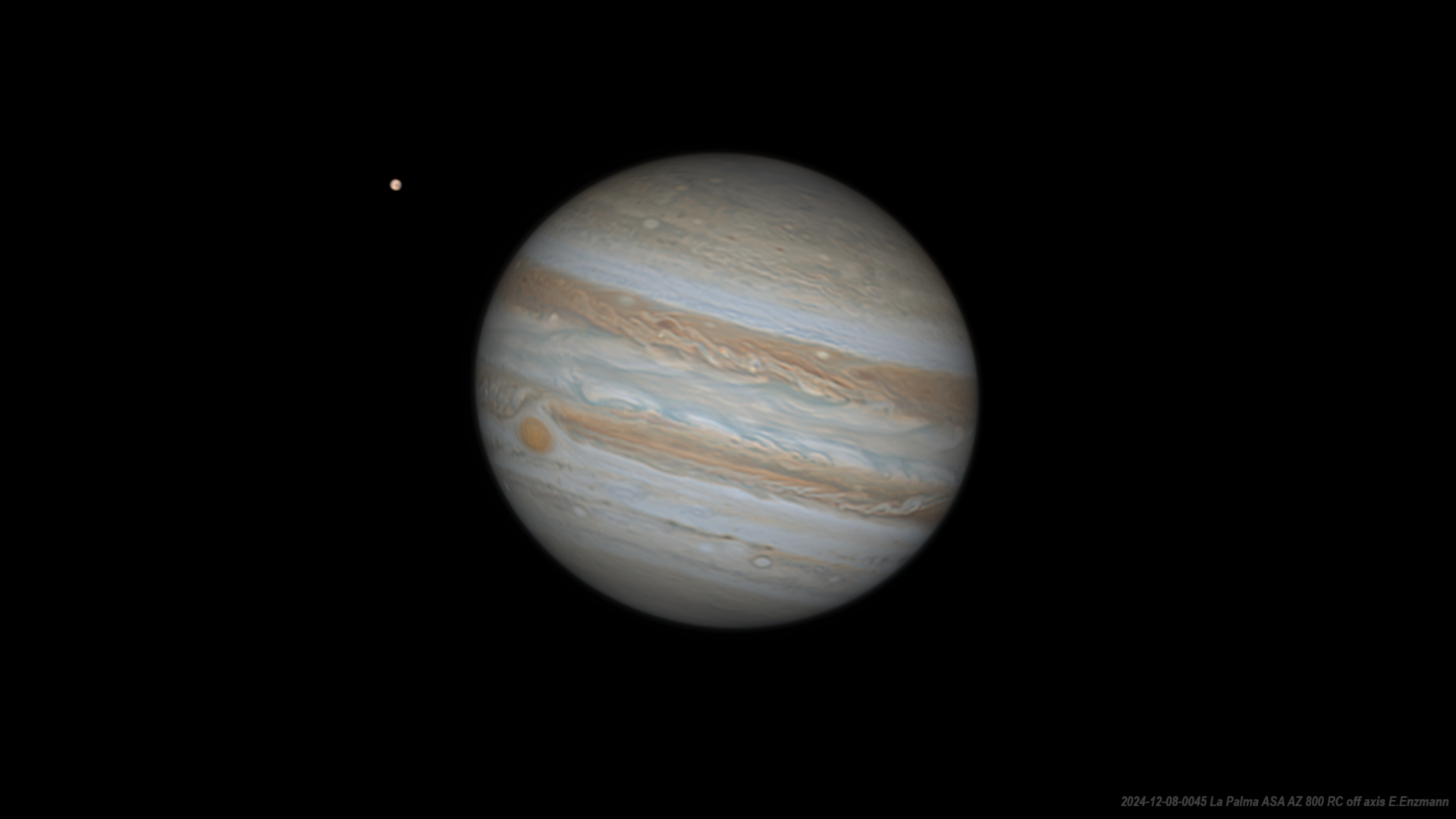 Am 7. Dezember 2024 stand Jupiter in Opposition zur Sonne und nur wenige Stunden danach ist diese Aufnahme unter mittelguten Seeing-Bedingungen auf La Plama entstanden. Das Bild zeigt den Jupitermond Europa, den Großen Roten Fleck und gegenüber ist der Ausbruch, über den ich schon hier berichtet hatte, im unteren Wolkenband schön zu sehen. Mittlerweile hat er die Form einer Kaulquappe angenommen. Insgesamt hat sich die Aufnahme dieses Bildes auf über 4,5 Stunden erstreckt! Es wurden die besten 99 Videos von je zwei Minuten also rund 3,5 Stunden für die Bildbearbeitung hergenommen. Solch eine lange Aufnahmezeit bei einem Planetenbild habe ich bisher noch nie verwendet und war bis vor kurzen auch nicht möglich. Aber wie man sieht, ist dies mit der neuen Version des Derotations-Programm WinJUPOS nun doch zu machen. Insgesamt wurden 198000 Einzelbilder für dieses Bild verwendet. Das Teleskop wurde dabei off axis betrieben.