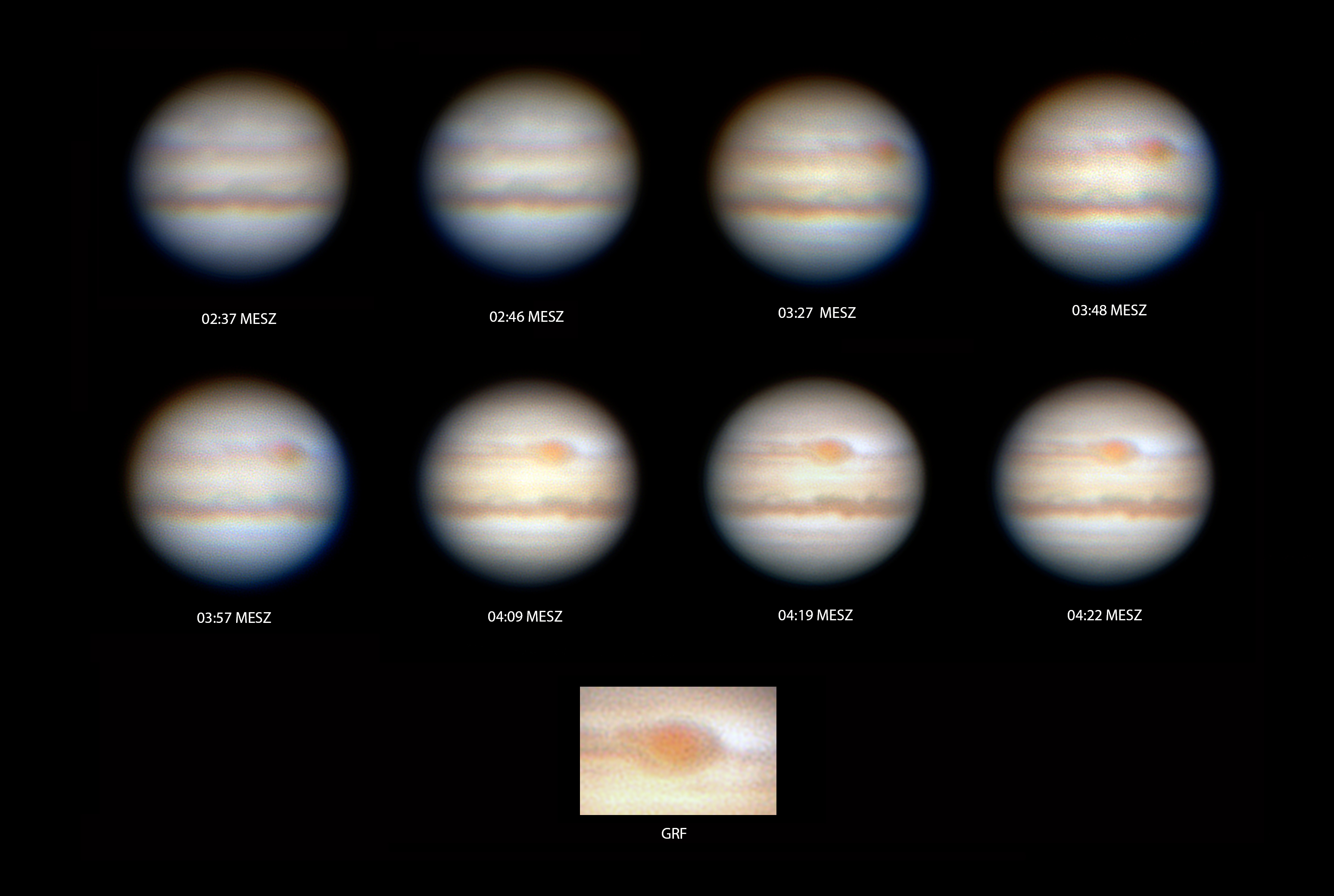 Der Wetterbericht sagte für den 25. Mai 2019 gutes Wetter und ruhiges Seeing voraus, und so stand ich sehr früh auf, um Jupiter und die Veränderungen des GRF zu beobachten. Leider hatte ich bei den ersten Bildern auch Probleme die richtigen Einstellungen des ADC Atmospheric Dispersion Corrector zu finden. Bei den letzten Bilder fand ich die richtigen Einstellungen doch noch, was sich sehr positiv auf die Bildqualität auswirkte.