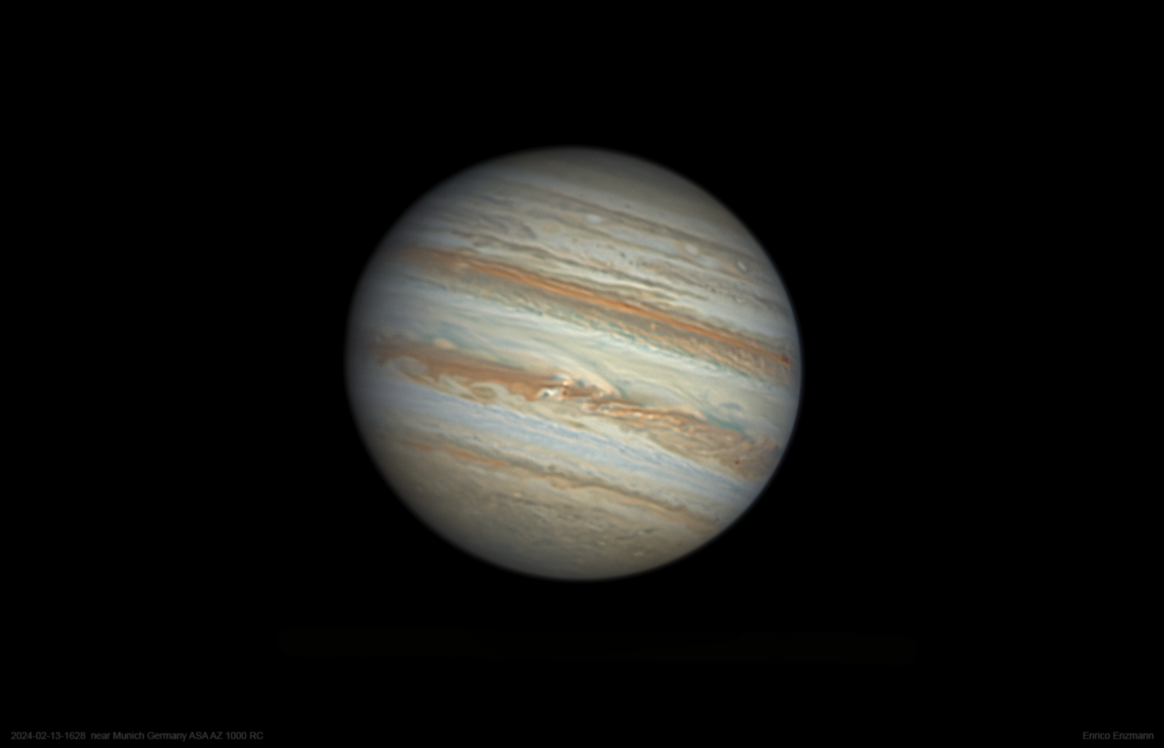 Dieses Jupiterbild aus Bayern vom 13. Februar 2024 ist etwas ganz Spezielles. Nicht weil es so gut ist, sondern weil es mit einem neuen Tool gemacht worden ist, das seit dem 14. Februar 2024 im Derotationsprogramm WinJUPOS verfügbar ist. Planetenbilder werden in aller Regel so gemacht, das man ca. 1 Minute lange Videos macht, daraus jeweils ein Bild über AutoStakkert! erstellt, das nach der Lucky-Imaging-Technik (nur die besten Bilder verwenden) das jeweilige Bild macht. Dann werden diese Bilder leicht geschärft. Da sich Jupiter sehr schnell um sich selbst dreht, müssen diese Einzelbilder derotiert werden. Dazu ist das Programm WinJUPOS ein ideales Tool. Dieses erlaubte bisher allerdings nur etwa 30 Minuten Derotation durchzuführen, einige sagen sogar nur 15 Minuten, da danach mehr oder weniger Randartefakte entstehen. Diese macht sich in einem abgedunkelten Rand ohne Bildinformationen bemerkbar und schmälert die Qualität des Bildes je nach Länge der Aufnahmedauer mehr oder weniger stark. Genau genommen sind ohne diese Fehler in Kauf zu nehmen nur rund 15 Minuten machbar. Dies schränkt die Zahl der guten Bilder stark ein, denn ab und an ist das Seeing längere Zeit gut. Nun hat sich Felix Langgassner dieser Thematik schon vor einigen Monaten angenommen und eine manuelle Art des Derotierens entwickelt. Diese Technik führt zu einer erhebliche Verbesserung gerade in den Randbereichen und hebt die Regel, nie mehr als 30 Minuten am Stück aufnehmen zu können, auf. Damian Peach hat diese Art und Weise in einem Video veröffentlicht. Nun hat glücklicherweise Grischa Hahn diese Technik seit dem 14. Februar 2024 in seinem Programm WinJUPOS integriert, was einen erheblichen Mehrwert für alle, die Planetenbilder machen, mit sich bringt. Neben den besseren Rändern erlaubt diese Möglichkeit noch stärker zu selektieren und mittelmäßige Bilder eher auszusortieren, da man nun viel mehr Zeit hat, nur die allerbesten Bilder zu verwenden. Bleibt zu hoffen das diese Technik auch für Planeten-Maps gemacht wird, da dies ein erhebliche Verbesserung und Erleichterung wäre, um einfacher Video-Animationen mit WinJUPOS zu erstellen.